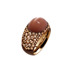 Ring with a brown moonstone cabochon, framed by ecru-colored diamonds, encased in gold bronze and lined on the inside with 750/000 rose gold.