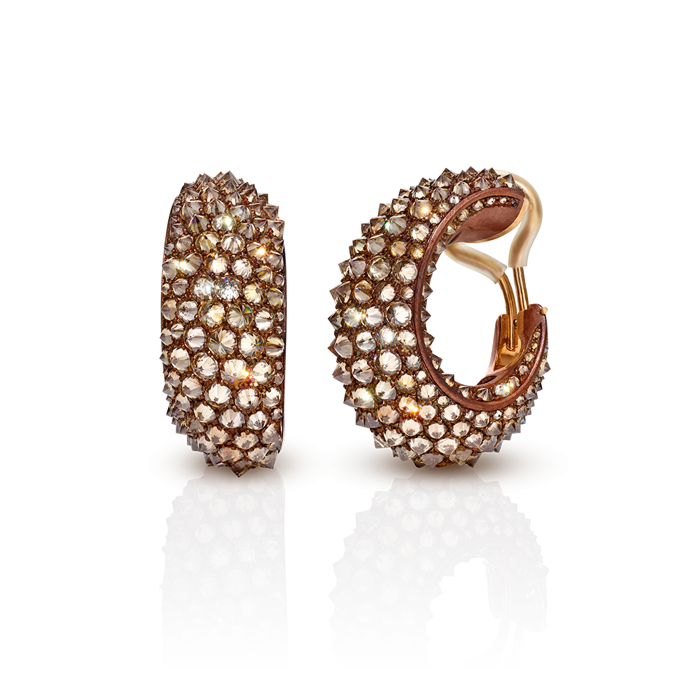 Creolen-Ohrringe, mit naturbraunen Diamanten bespikt (umseitig gefasst), aus der "Symphony"-Kollektion, in Bronze und 750/000 Roségold gearbeitet. Ein rechter und ein linker Ohrring garantieren den perfekten Sitz am Ohr.