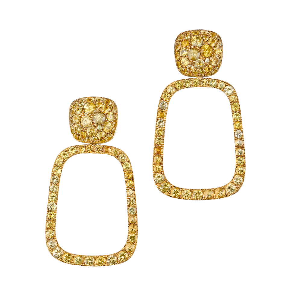 Zweiteilige Ohrringe mit antikoval geformten Oberteilen und schwebenden Rahmen-Anhängern, die mit gelben Saphiren besetzt sind, gefasst in 750/000 Gelbgold. Dank unsichtbarer Wechselmechaniken lassen sie sich kurz oder lang tragen und mit weiteren Elementen kombinieren.