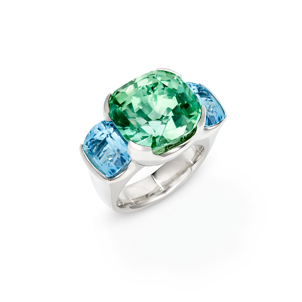 Ring mit einem antikoval facettierten afghanischen Turmalin, flankiert von lagoonfarbenen Aquamarinen, in 750/000 Weißgold gefasst.