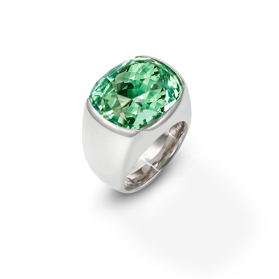 PURE LAGOONEin antikovaler Himalaya-Turmalin (Provenienz Nordostafghanistan) von 21,51 ct., in 750 Weißgold gefasst. NGL_ZURUECKZU Ringe