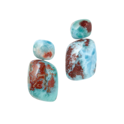 Die feinen Schattierungen des Larimar in Erdtönen und Ozeanblau spiegeln sich funkelnd in den Oberteilen und intensivieren das lebhafte Farbspiel der Ohrgeschmeide. Mit ihrer abgeschrägten Form folgen sie den Gesichtszügen ihrer Trägerin