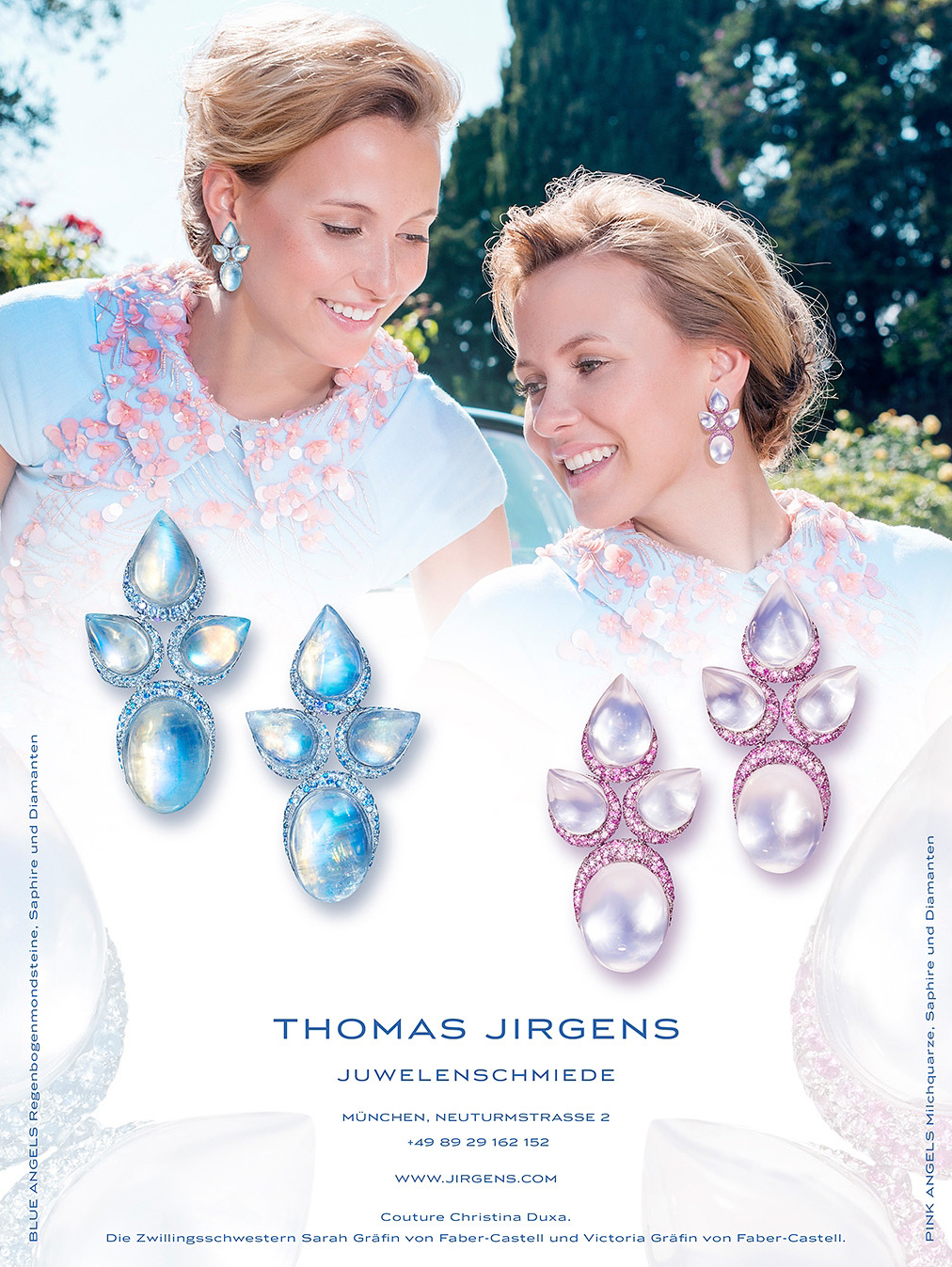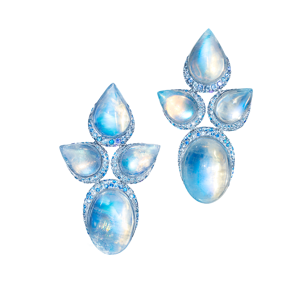 Earrings made of drop-shaped rainbow moonstone cabochons, arranged like angel wings, in a crescent-shaped frame of blue sapphires and white diamonds, set in 750/000 white gold. Custom-made, length as shown here is 4.5 cm (1.8 in).