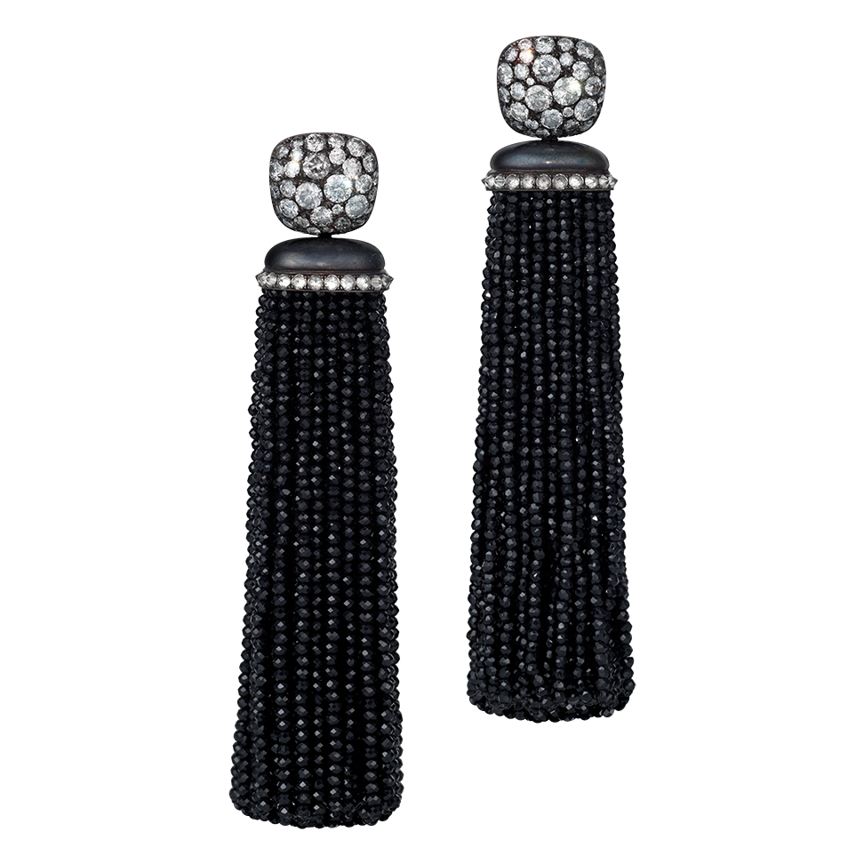 NIGHTFALLSEarrings with tassels made of black spinel and diamond tops, set in 750/000 Weißgold. Custom-made. back to Earrings