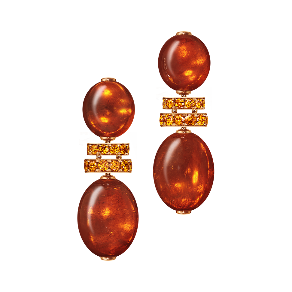Earrings with mandarin garnet cabochons and facetted mandarin garnet bars, set in 750/000 red gold. Custom-made, length as shown here is 5 cm (2 in).