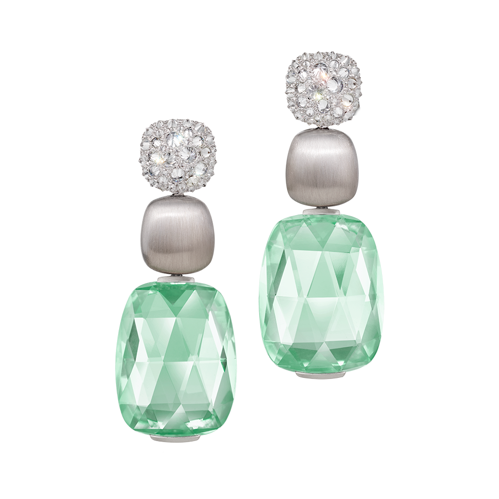 Grüne Aquamarine aus Brasilien sind verbunden mit cremetonigem Weißgold im Verlauf zu feinweißen Diamanten. Die Ohrringe 'Beryllo' sind verbunden mit einer unsichtbaren Wechselmechanik.