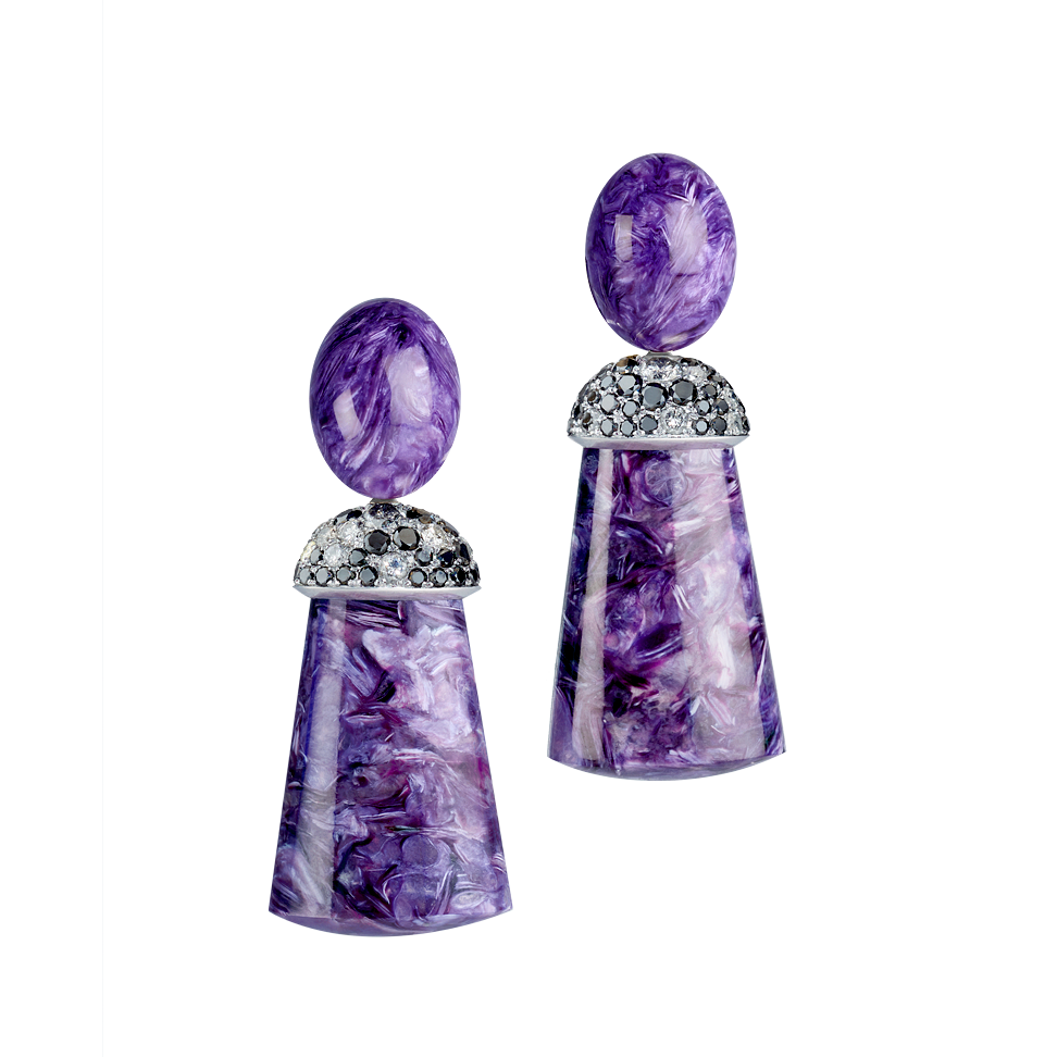 Earrings with charoite tassels and cabochons as well as diamond-studded caps, set in 750/000 white gold. Custom-made, length as shown here is 5 cm (2 in).