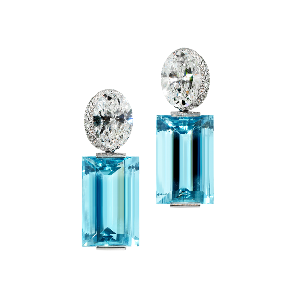 Earrings with graphically cut aquamarines ~ "Clear Crystals" ~ on oval faceted, pure white diamonds, in a crescent-shaped frame of white diamonds, set in 750/000 white gold. Custom-made, length as shown here is 4 cm (1.6 in).