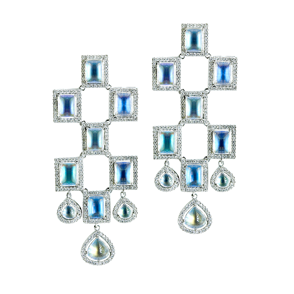 Chandelier earrings with rectangular cut suspended rainbow moonstones and drop-shaped pendants, framed by white diamonds and set in 750/000 white gold. Custom-made, length as shown here is 5.5 cm (2.2 in).