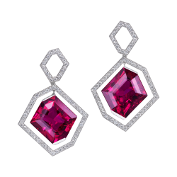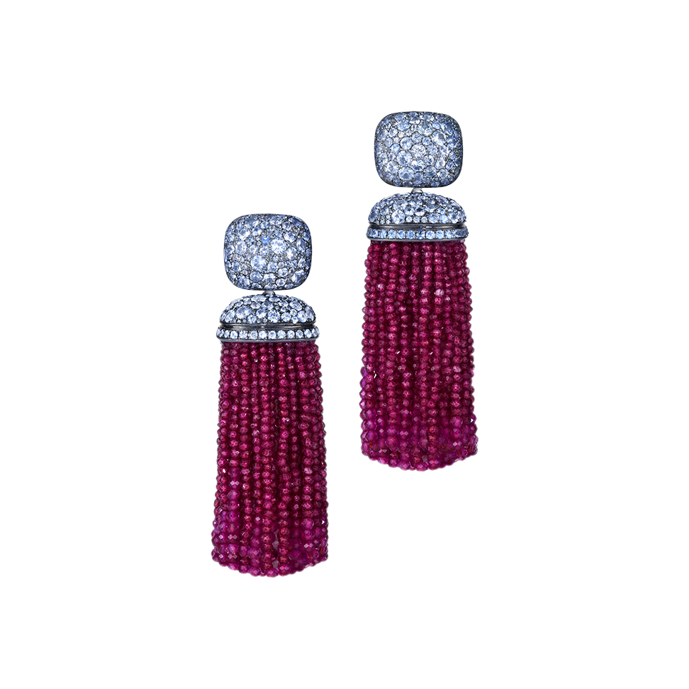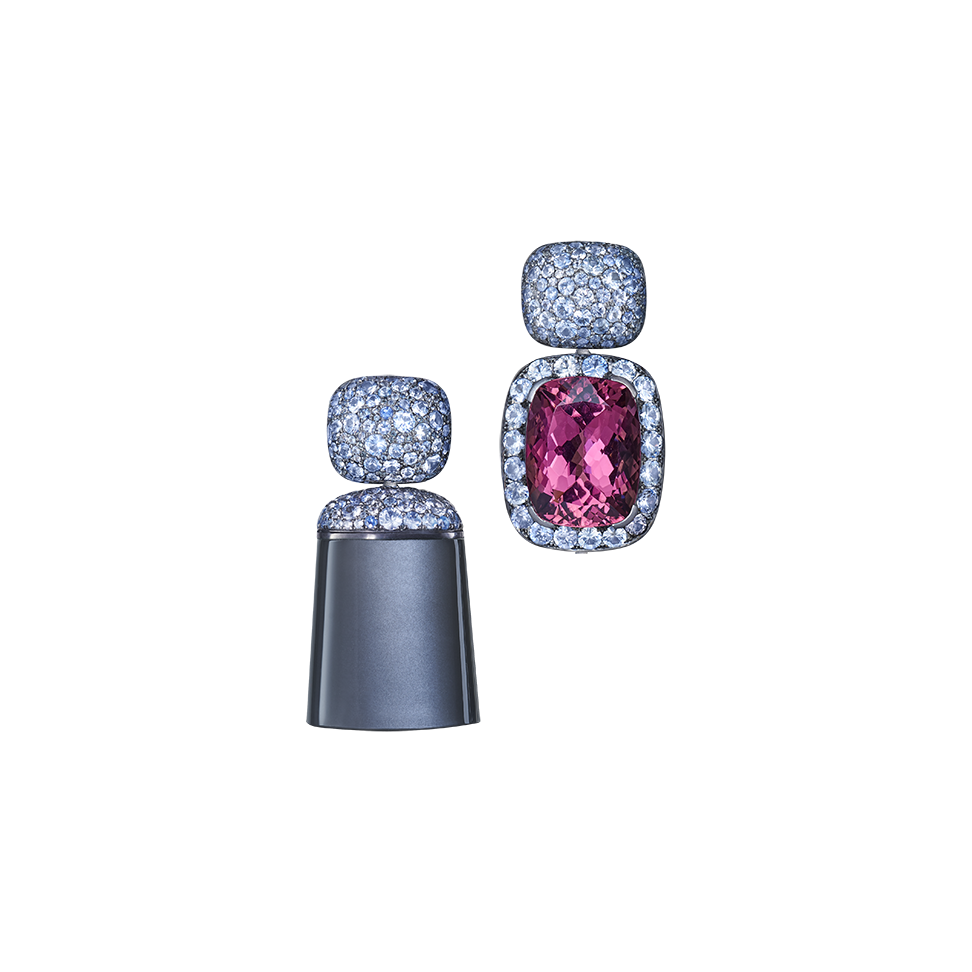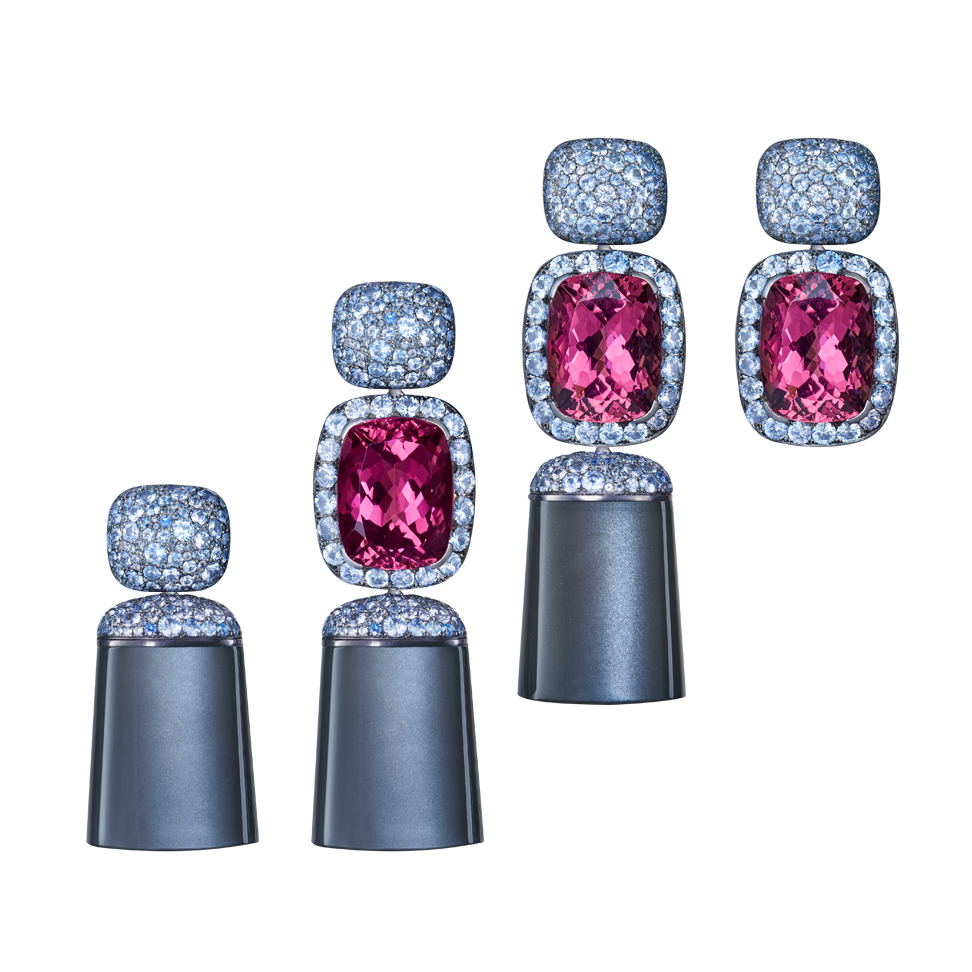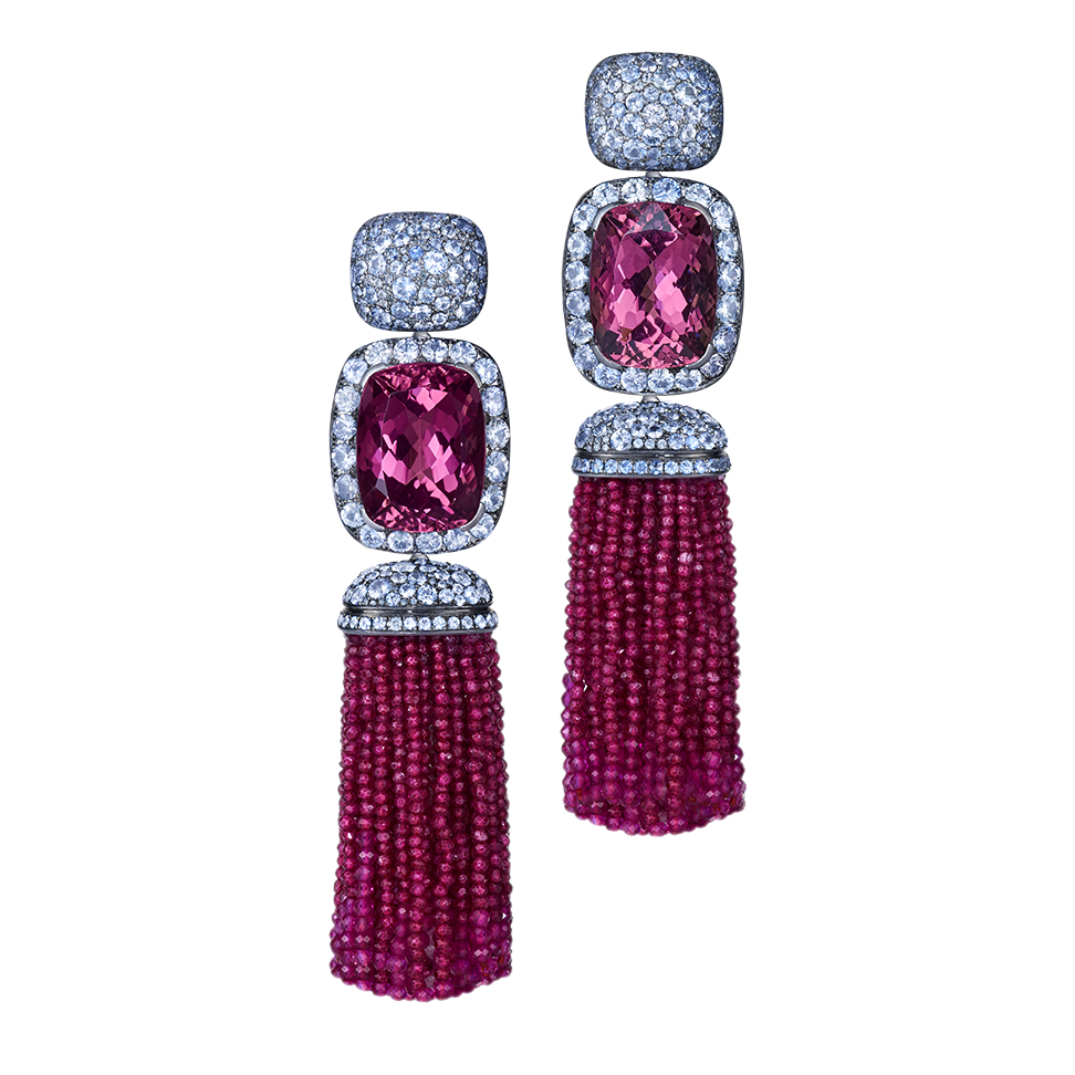 Three-piece earrings with pink tourmalines, ice blue Ceylon sapphires and tassels of pink spinel, crafted in 750/000 white gold. By means of an invisible exchange mechanism ("Trinity Transformers") they can be worn short or long or with tassels made of pure moonstone. Custom-made, length as shown here is 6 cm (2.4 in).