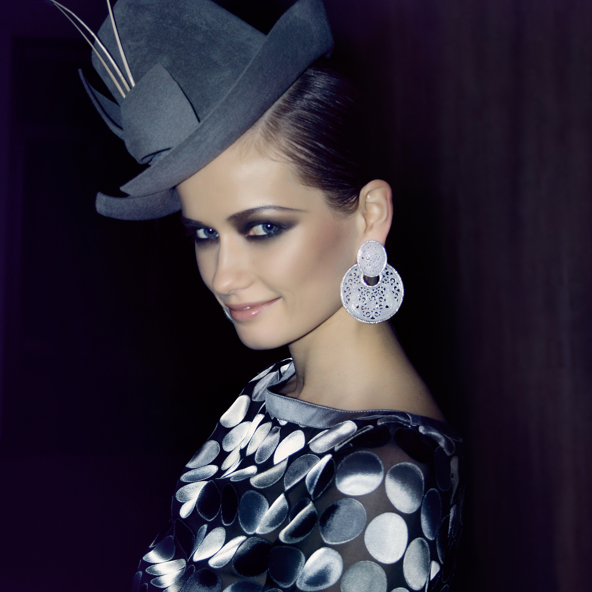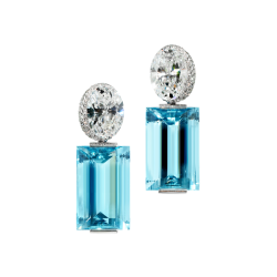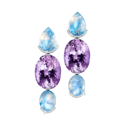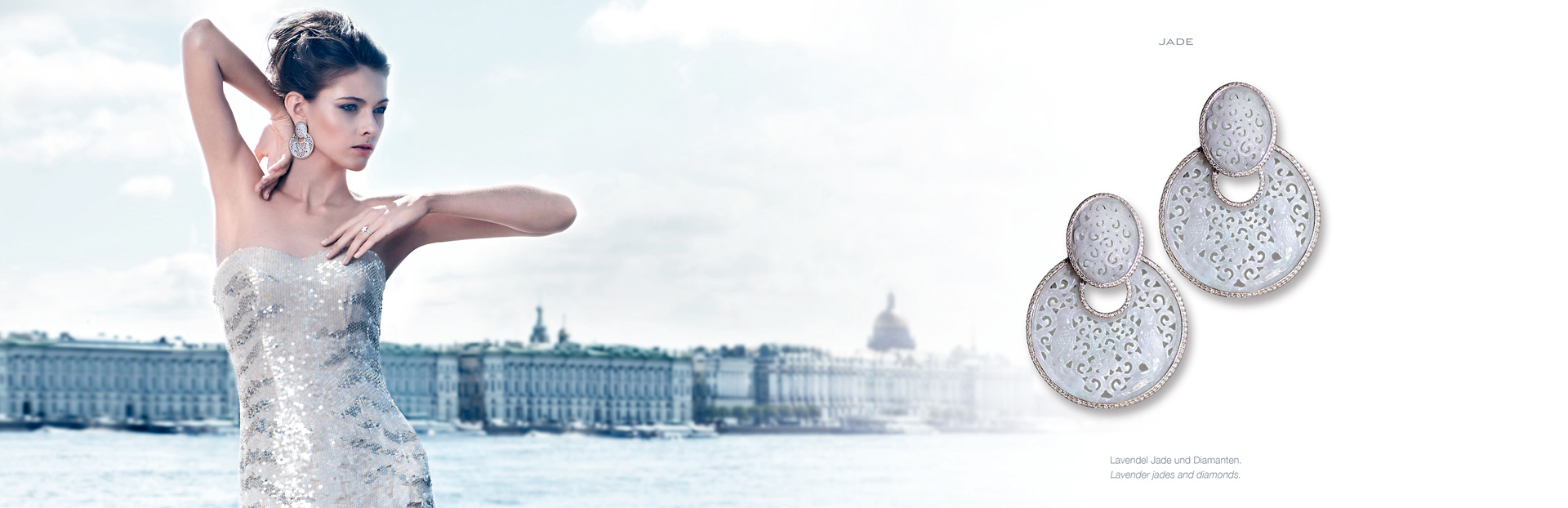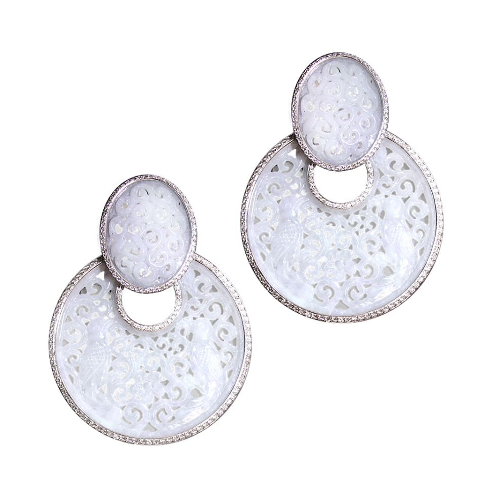 Earrings with engraved discs of white Burmese Jade, framed by white diamonds and set in 750/000 white gold. The top pieces can also be worn on their own. Custom-made, length shown 5.5 cm (2.2 in).