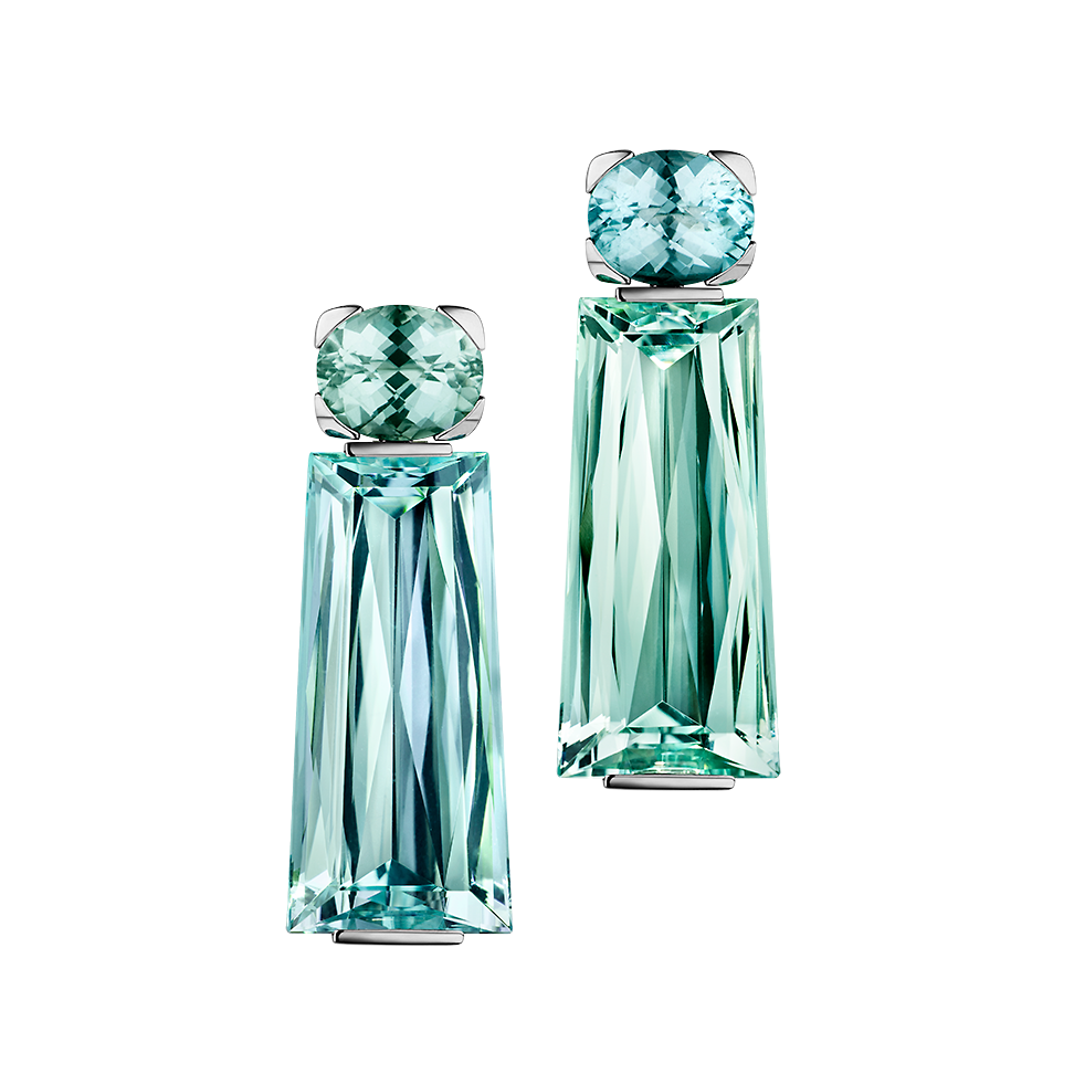 Earrings with tapered baguette cut aquamarines from Brazil and Africa as well as oval cut Afghanistan Tourmalines ~ "Clear Crystals" ~, set in 750/000 white gold. Custom-made, length as shown here is 4.5 cm (1.8 in).