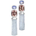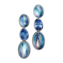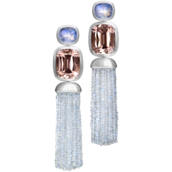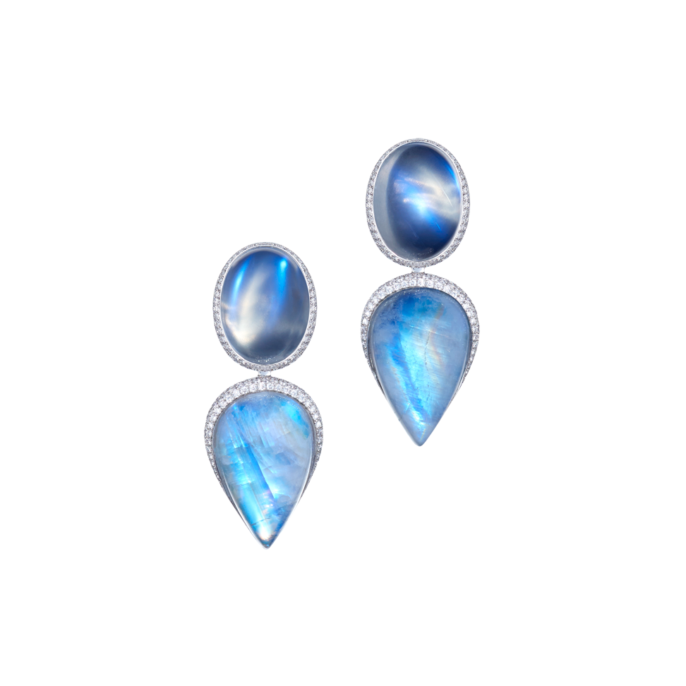 Two-piece earrings with drop-shaped and oval cabochons made of Indian rainbow moonstone, framed by white diamonds and set in 750/000 white gold. By means of an invisible exchange mechanism they can be combined with other elements. Custom-made, length as shown here is 3 cm (1.2 in).
