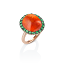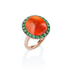Ring with a 16 ct. antique oval mandarin garnet cabochon, framed by tsavorites and set in 750/000 rose gold.