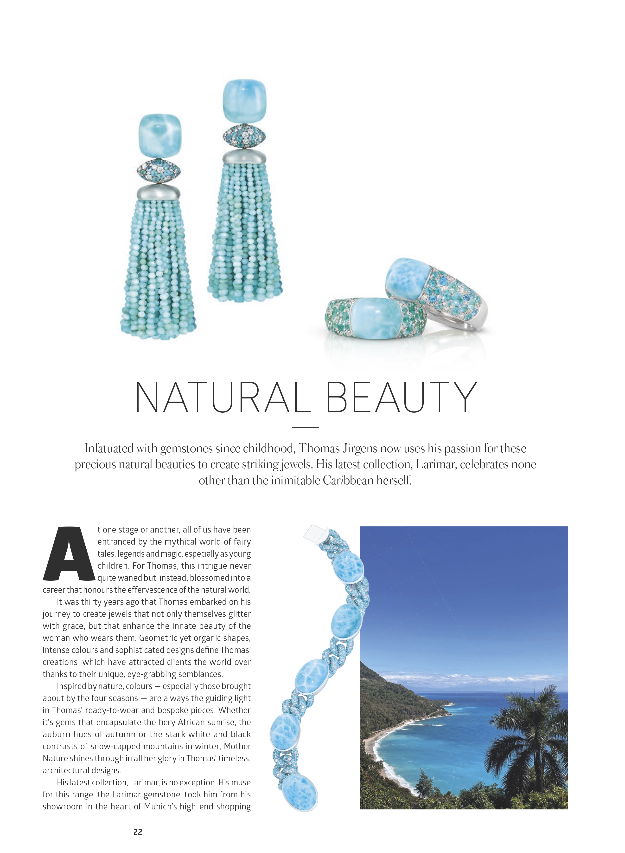 At one stage or another, all of us have been entranced by the mythical world of fairy tales, legends and magic, especially as young children. For Thomas, this intrigue never quite waned but, instead, blossomed into a career that honours the effervescence of the natural world. It was thirty years ago that Thomas embarked on his journey to create jewels that not only themselves glitter with grace, but that enhance the innate beauty of the woman who wears them. Geometric yet organic shapes, intense colours and sophisticated designs defi ne Thomas’ creations, which have attracted clients the world over thanks to their unique, eye-grabbing semblances. Inspired by nature, colours — especially those brought about by the four seasons — are always the guiding light in Thomas’ ready-to-wear and bespoke pieces. Whether it’s gems that encapsulate the fi ery African sunrise, the auburn hues of autumn or the stark white and black contrasts of snow-capped mountains in winter, Mother Nature shines through in all her glory in Thomas’ timeless, architectural designs. His latest collection, Larimar, is no exception. His muse for this range, the Larimar gemstone, took him from his showroom in the heart of Munich’s high-end shopping district, Maximilianstraße, to the Dominican Republic to unearth a blue-hued beauty that captures the ocean’s wealth of colours unlike any other.