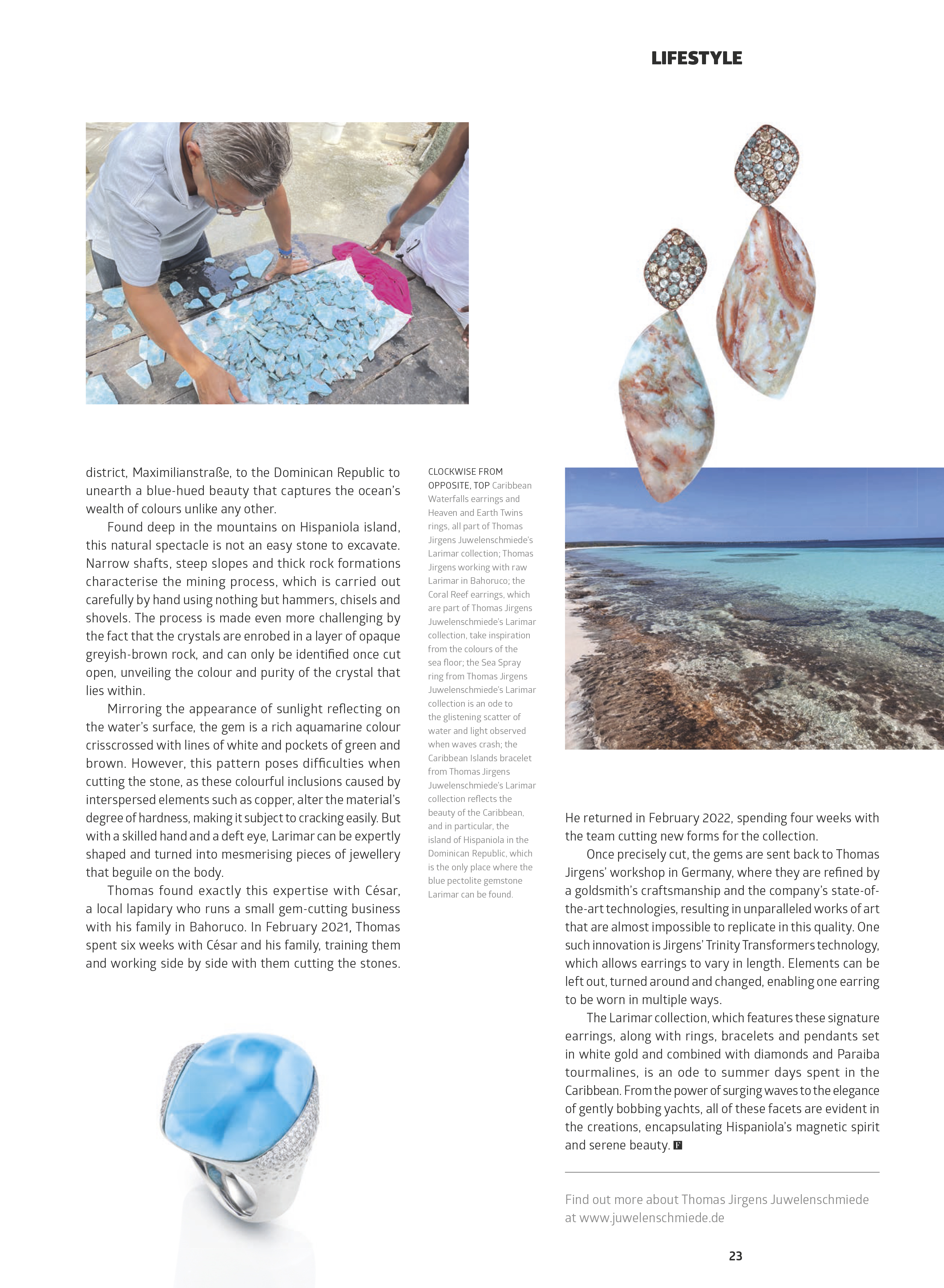 He returned in February 2022, spending four weeks with the team cutting new forms for the collection. Once precisely cut, the gems are sent back to Thomas Jirgens’ workshop in Germany, where they are refi ned by a goldsmith’s craftsmanship and the company’s state-ofthe-art technologies, resulting in unparalleled works of art that are almost impossible to replicate in this quality. One such innovation is Jirgens’ Trinity Transformers technology, which allows earrings to vary in length. Elements can be left out, turned around and changed, enabling one earring to be worn in multiple ways. The Larimar collection, which features these signature earrings, along with rings, bracelets and pendants set in white gold and combined with diamonds and Paraiba tourmalines, is an ode to summer days spent in the Caribbean. From the power of surging waves to the elegance of gently bobbing yachts, all of these facets are evident in the creations, encapsulating Hispaniola’s magnetic spirit and serene beauty.