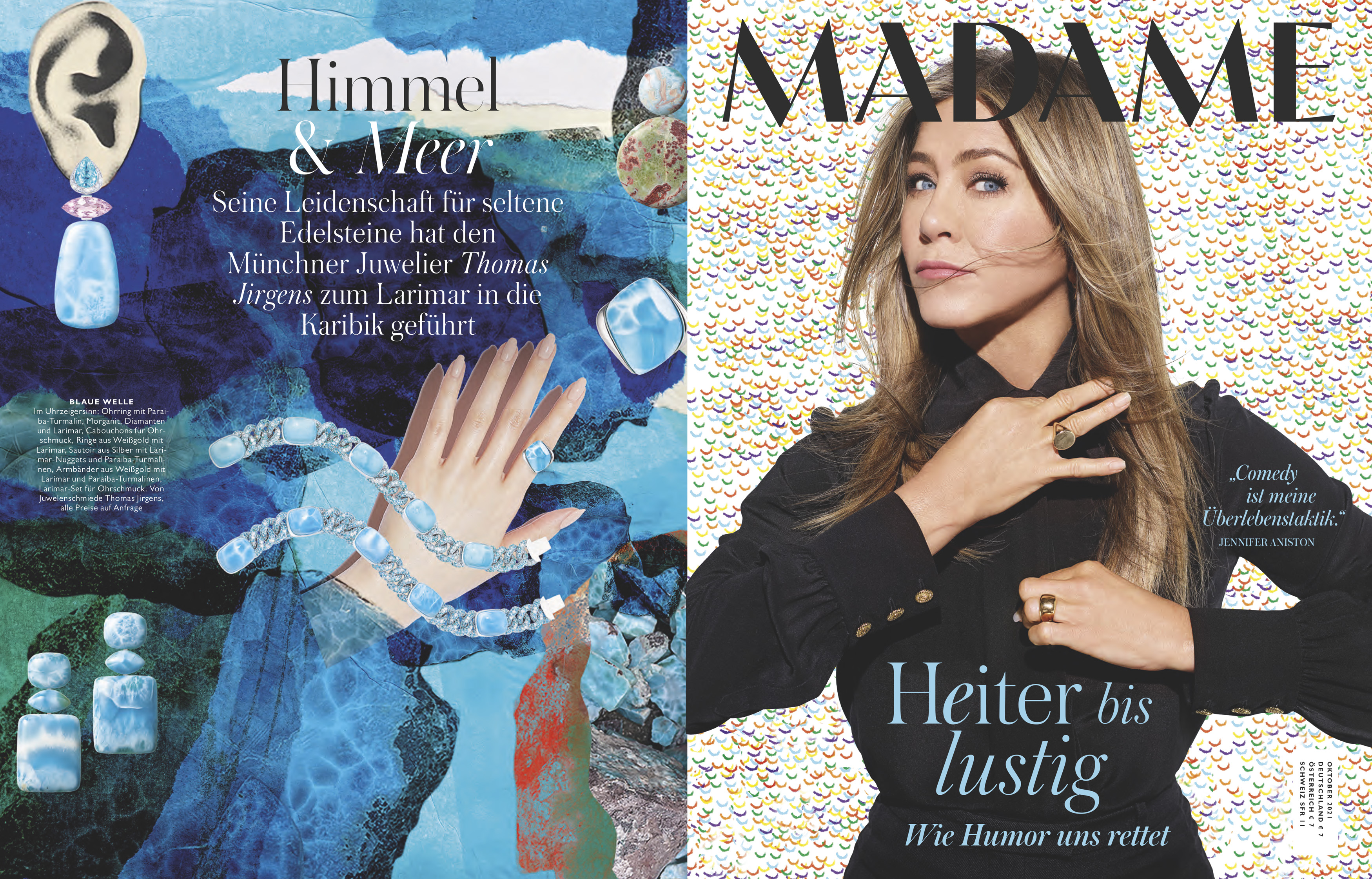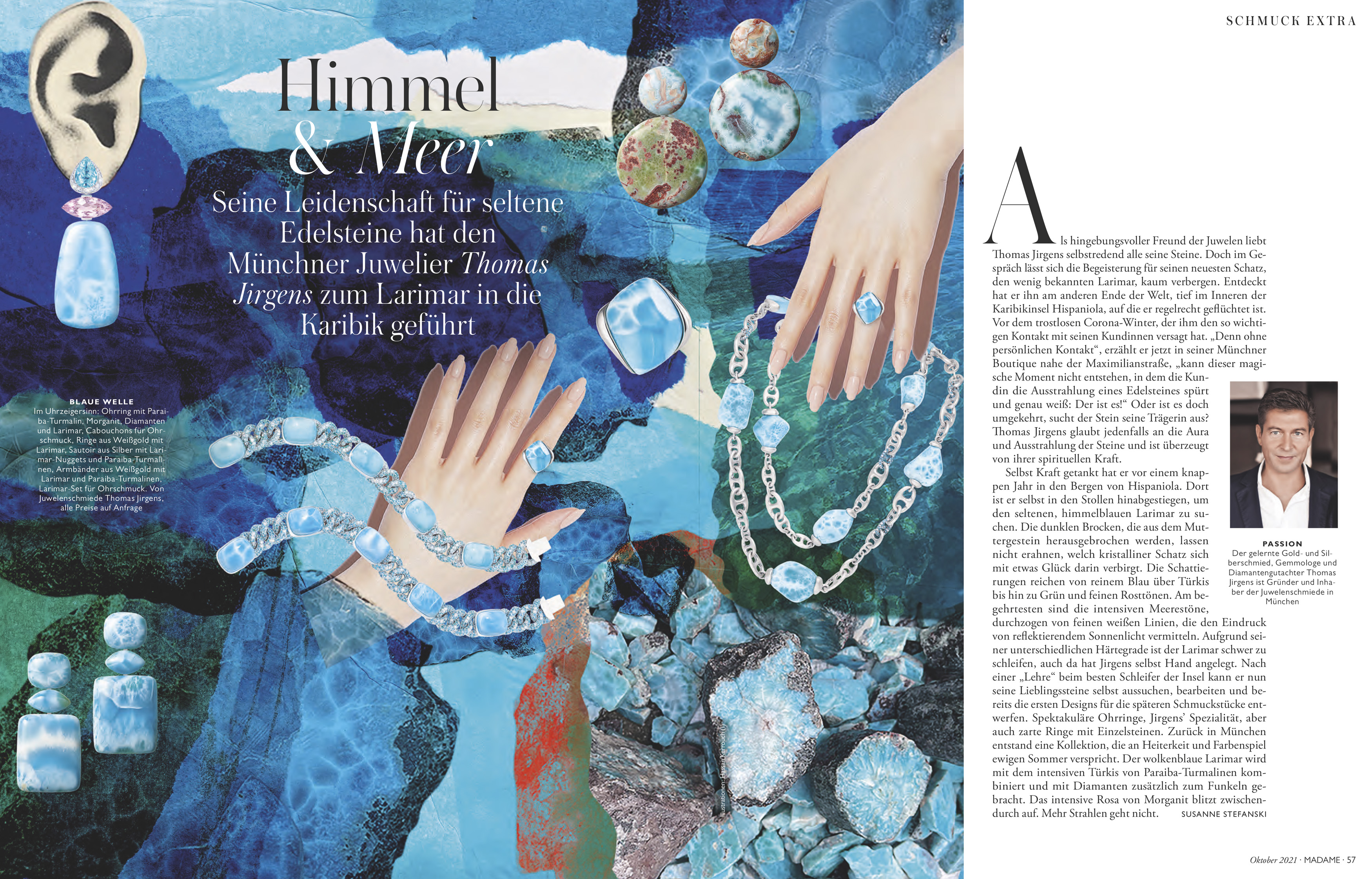 Als hingebungsvoller Freund der Juwelen liebt Thomas Jirgens selbstredend alle seine Steine. Doch im Gespräch lässt sich die Begeisterung für seinen neuesten Schatz,den wenig bekannten Larimar, kaum verbergen. Entdeckt hat er ihn am anderen Ende der Welt, tief im Inneren der Karibikinsel Hispaniola, auf die er regelrecht geflüchtet ist. Vor dem trostlosen Corona-Winter, der ihm den so wichtigen Kontakt mit seinen Kundinnen versagt hat. „Denn ohne persönlichen Kontakt“, erzählt er jetzt in seiner Münchner Boutique nahe der Maximilianstraße, „kann dieser magische Moment nicht entstehen, in dem die Kundin die Ausstrahlung eines Edelsteines spürt und genau weiß: Der ist es!“ Oder ist es doch umgekehrt, sucht der Stein seine Trägerin aus? Thomas Jirgens glaubt jedenfalls an die Aura und Ausstrahlung der Steine und ist überzeugt von ihrer spirituellen Kraft.