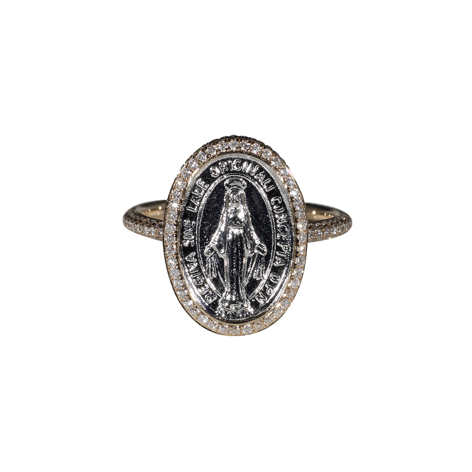 Ring mit Madonna-Medaillon und Diamanten in Rosé- und Weißgold.