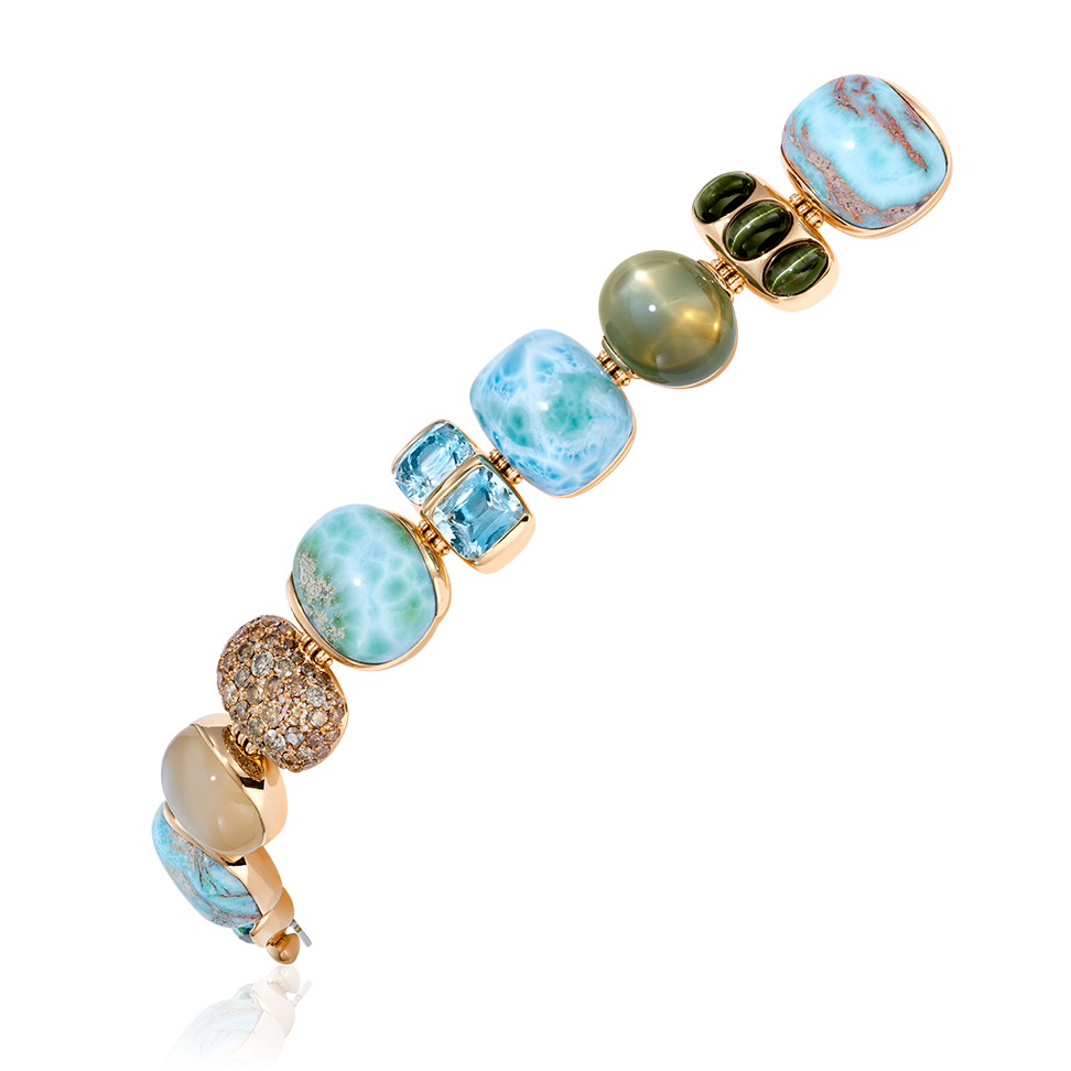 Armband mit zehn Gliedern, die mit Larimar, grünem und nudefarbenem Mondstein, naturfarbenen Brillanten sowie Katzenaugenturmalinen die farbliche Tiefe des Meeres ergründen. Gefasst in 750/000 Roségold mit einer unsichtbaren Schließe.