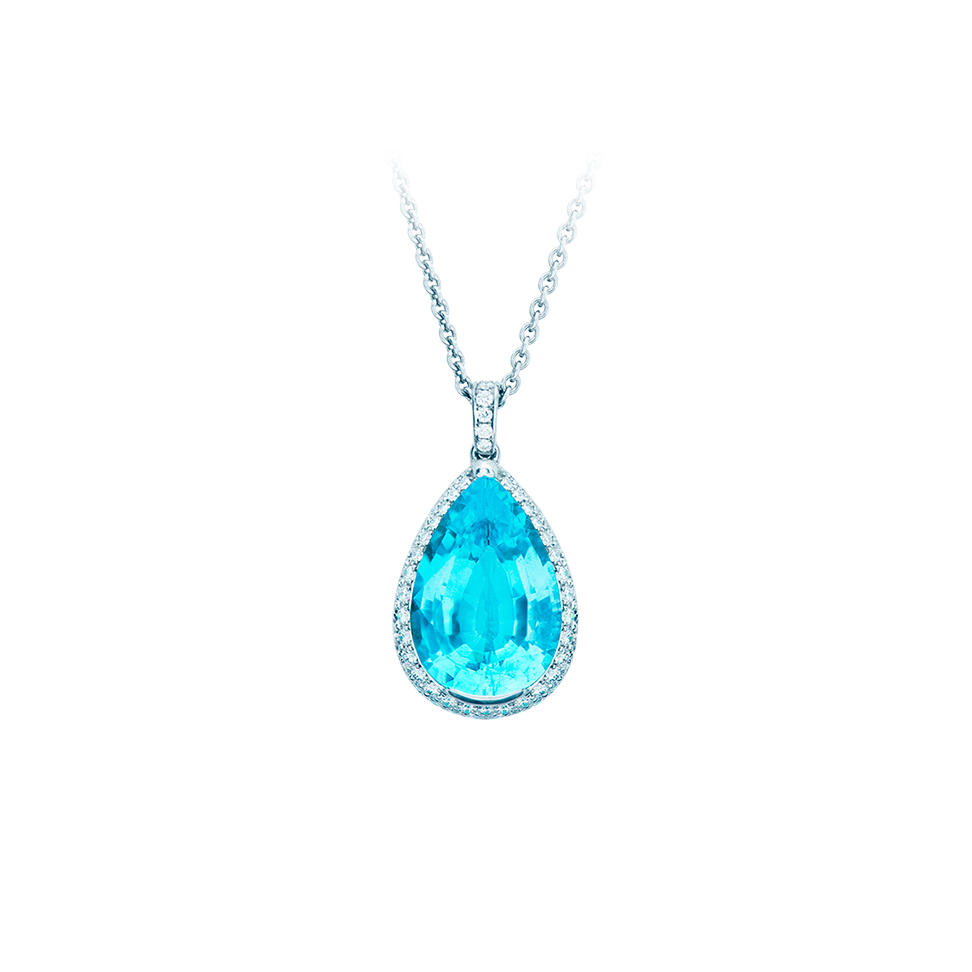 Halskette mit facettiertem Paraiba-Turmalin-Tropfen, Provenienz Mosambik, von hochweißen Diamanten gerahmt und in 750/000 Weißgold gefasst.