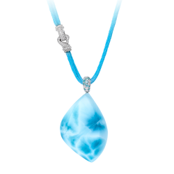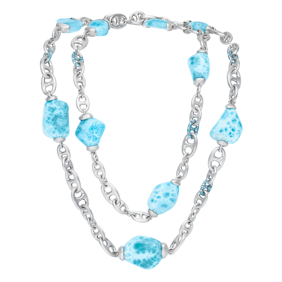 Collier mit Larimar-Nuggets, verbunden durch silberne Ankerketten, deren fünf Schlösser mit Paraiba-Turmalinen und weißen DIamanten ausgefasst sind. Dadurch lässt sich die Länge variieren und einzelne Elemente können als komplementierendes Armband getragen werden.