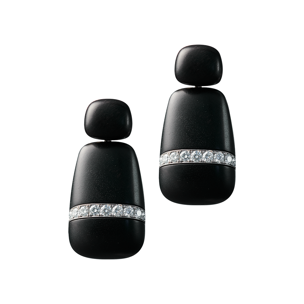 Ohrringe mit organisch geformten Ebenholz-Cabochons und Intarsien aus weißen Diamanten, in 750/000 Weißgold gefasst. Maßanfertigung, gezeigte Länge 5 cm.