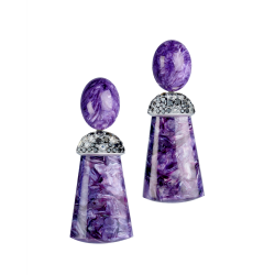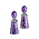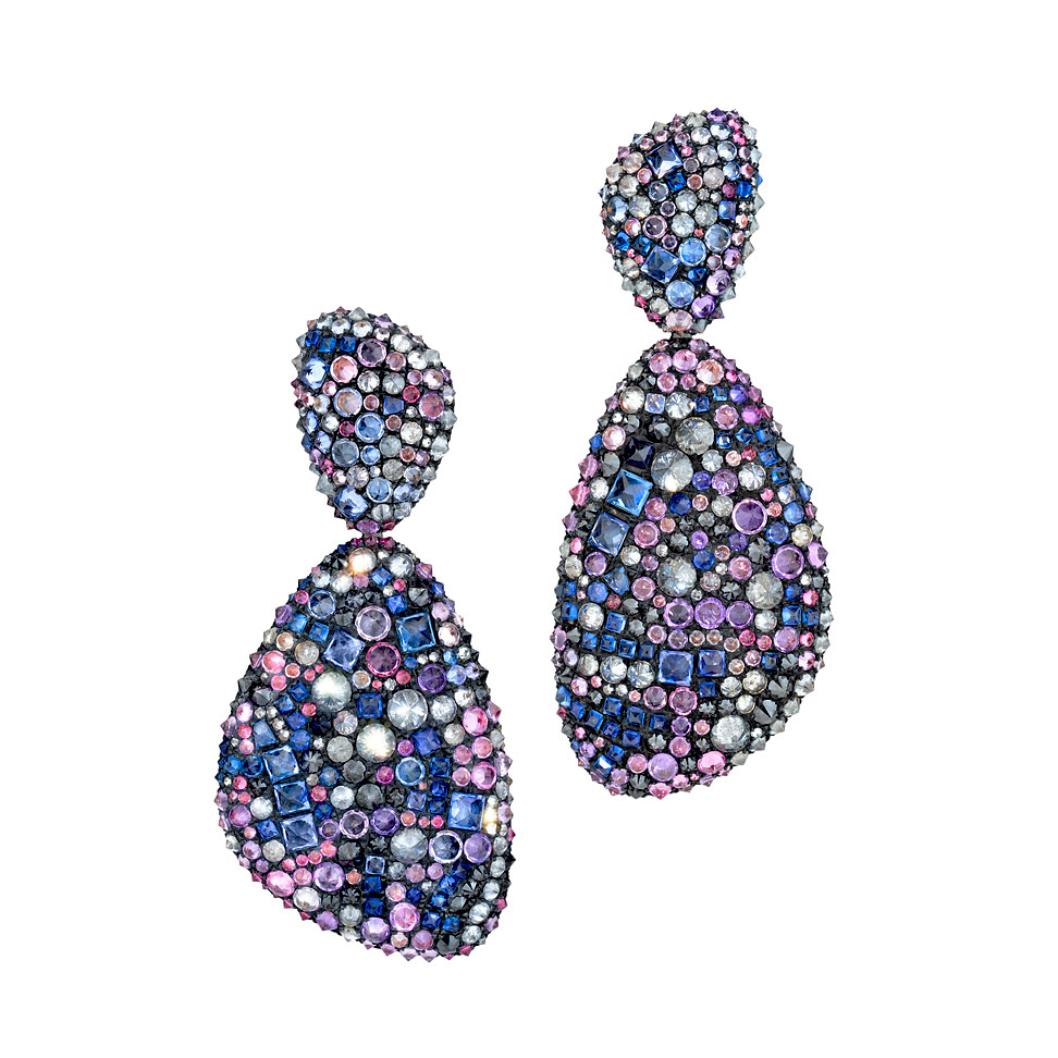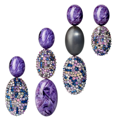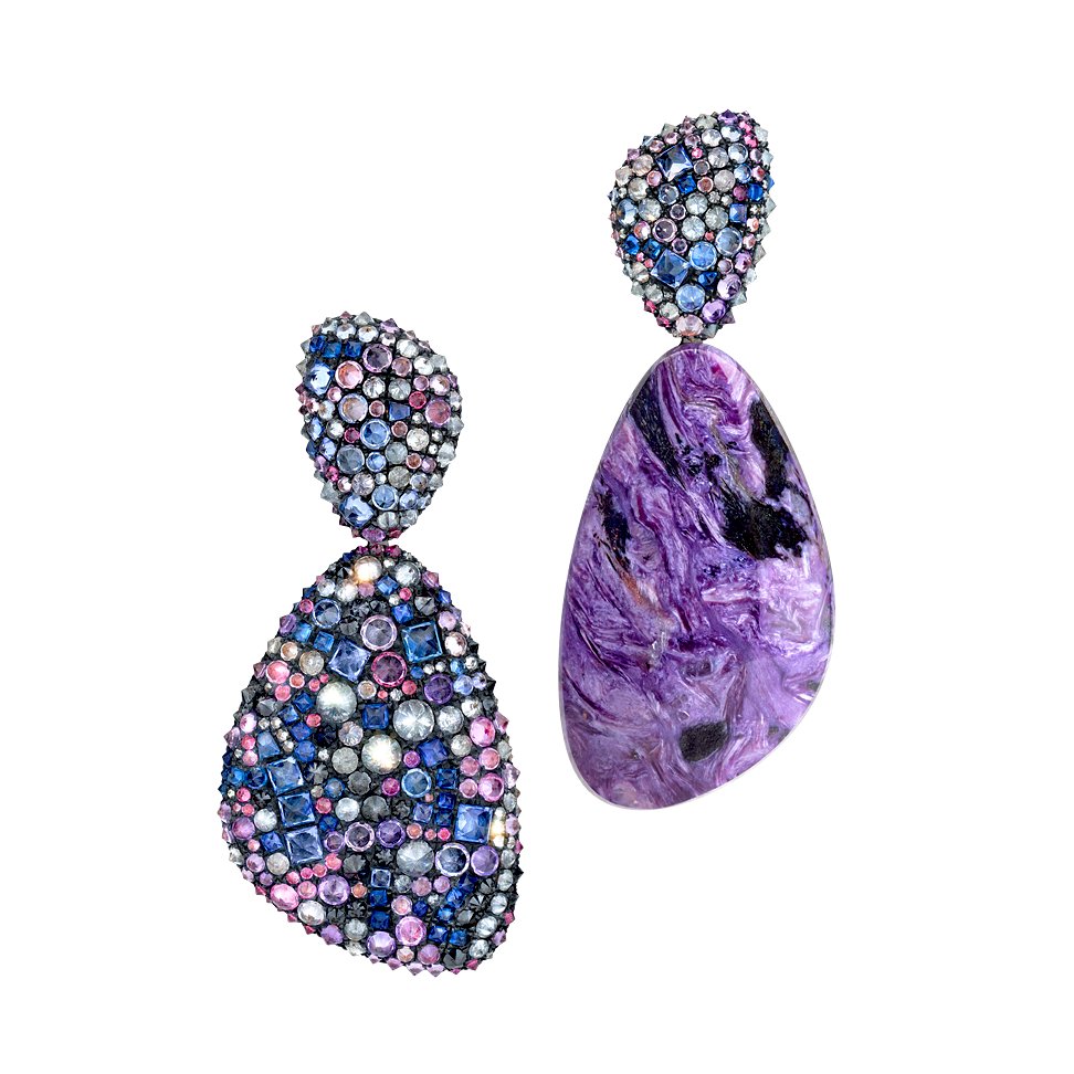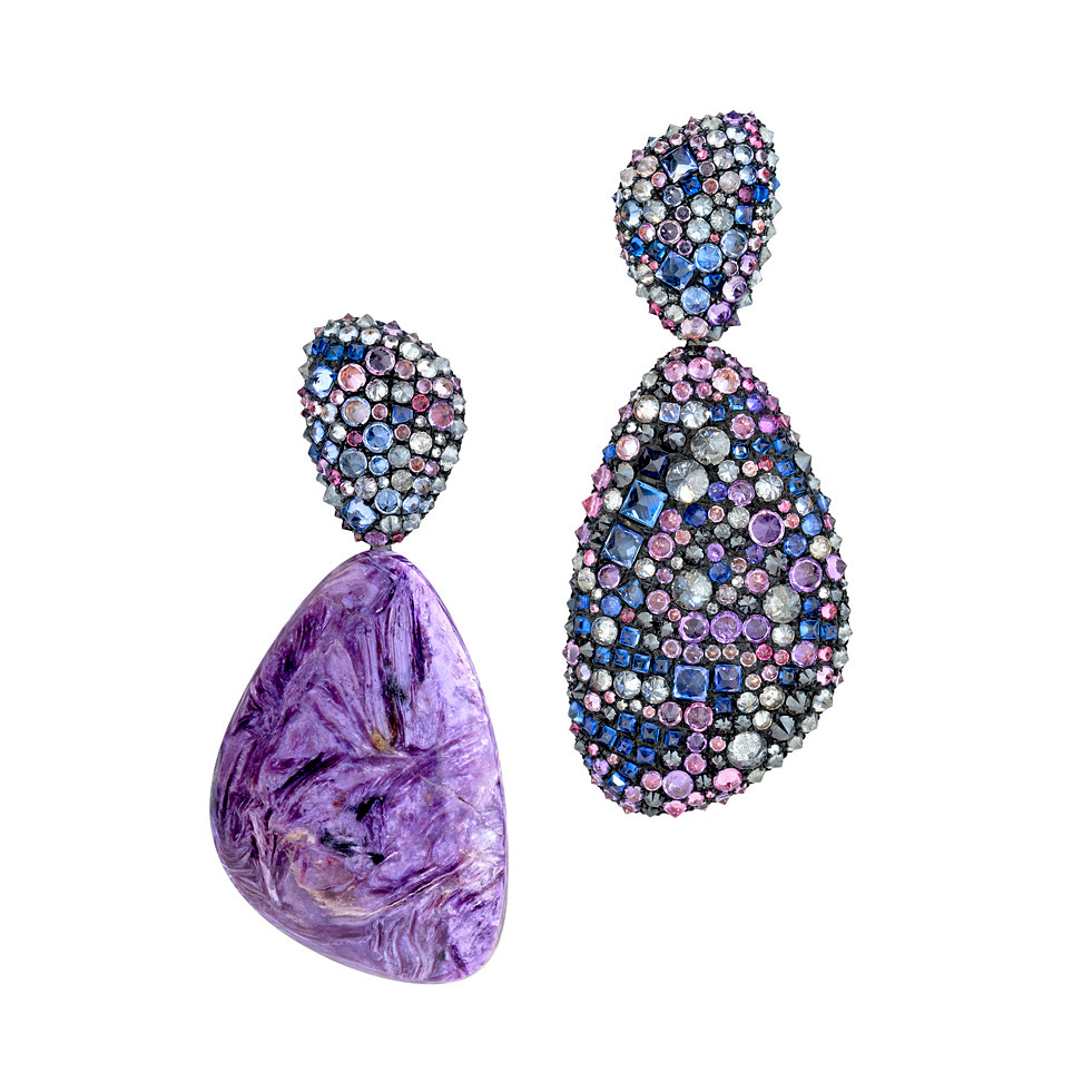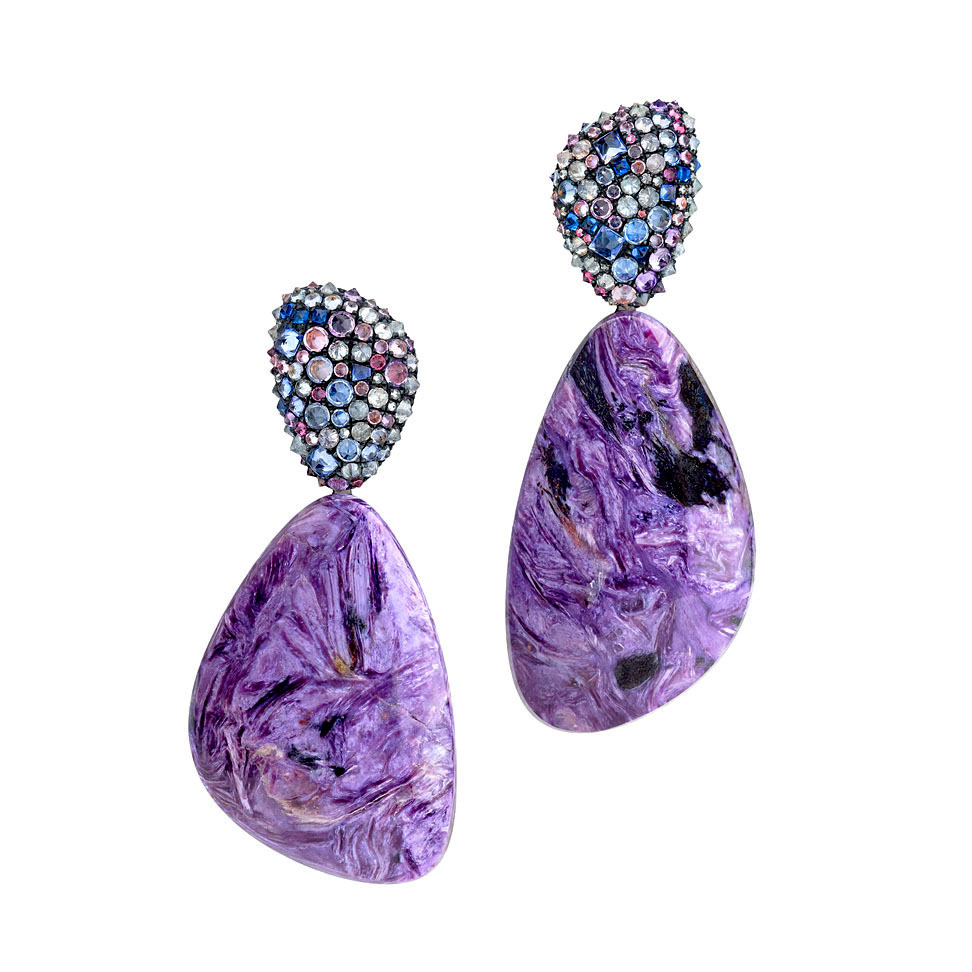 Ohrringe mit fantasiegeschliffenem Charoit sowie einem begleitenden Farbspektrum aus Saphiren und Diamanten auf Rückseiten und Oberteilen, in 750/000 Weißgold gefasst. Dank unsichtbarer Wechselmechaniken lassen sie sich die Unterteile umdrehen oder tauschen. Maßanfertigung, gezeigte Länge 5 cm.