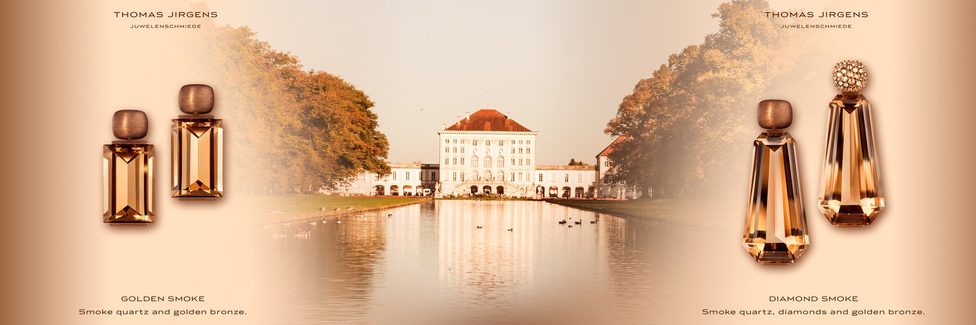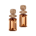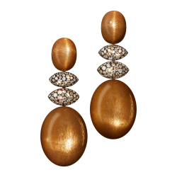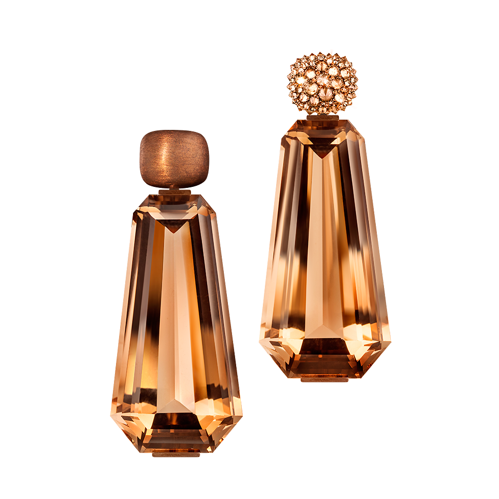 Ohrringe mit architektonisch geschliffenen Rauchquarzen an einem mit naturbraunen Diamanten bespikten (umgekehrt gefassten) Oberteil bzw. purer Goldbronze. Dank unsichtbarer Wechselmechaniken lassen sich die Unterteile variieren. Maßanfertigung, gezeigte Länge 6 cm.