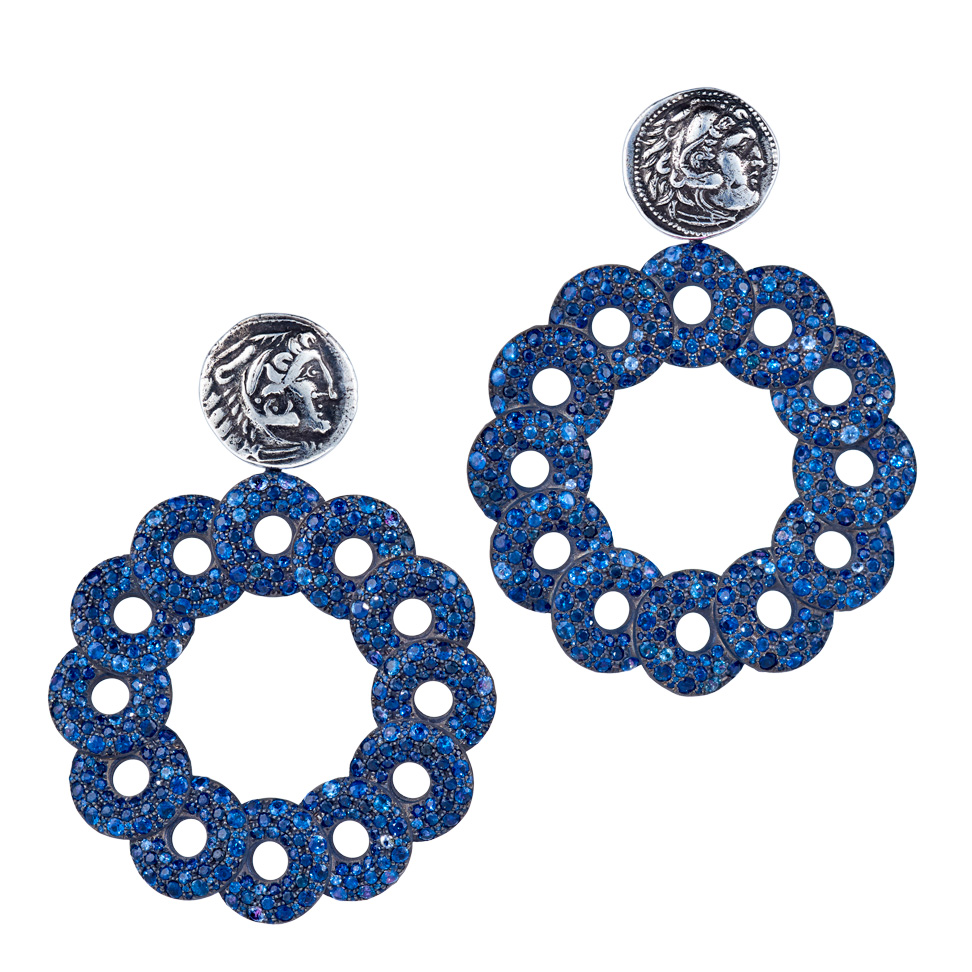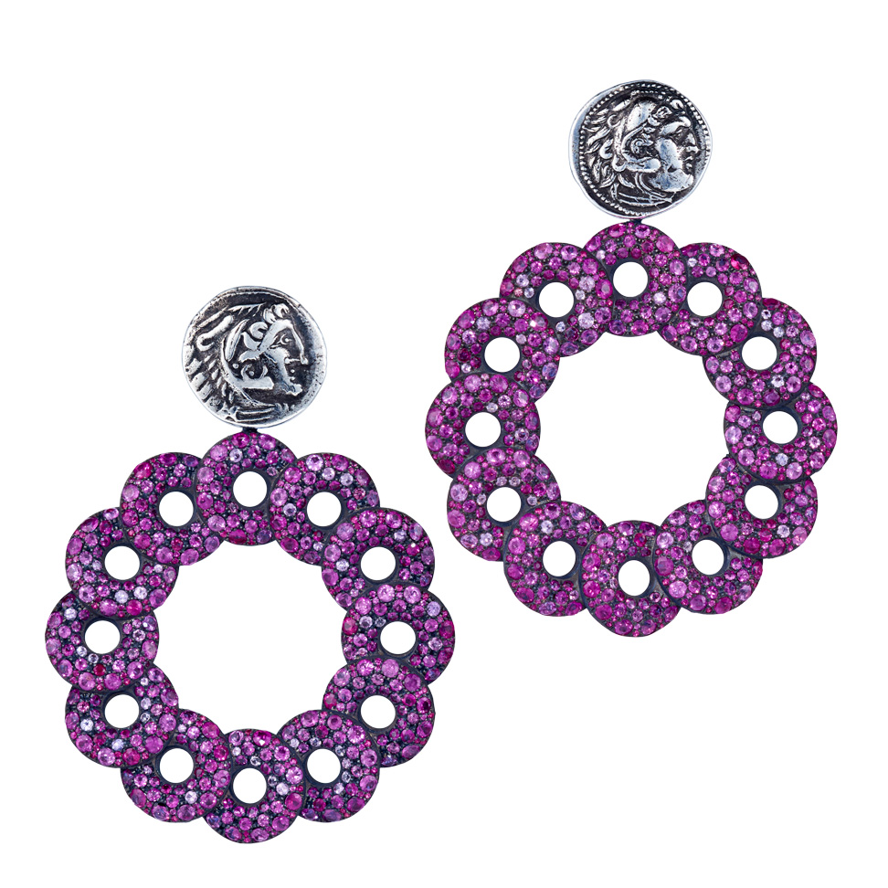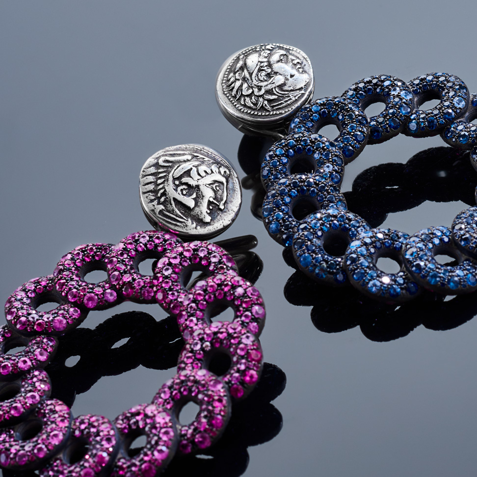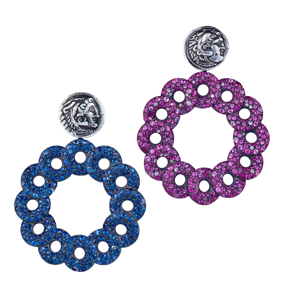 Ohrringe aus beidseitig mit Saphiren und Rubinen besetzten Diskussen und griechischen Drachmen, in Silberbronze gefasst. Dank unsichtbarer Wechselmechaniken lassen sie sich mit beiden Seiten nach vorne tragen. Maßanfertigung, gezeigte Länge 6 cm.
