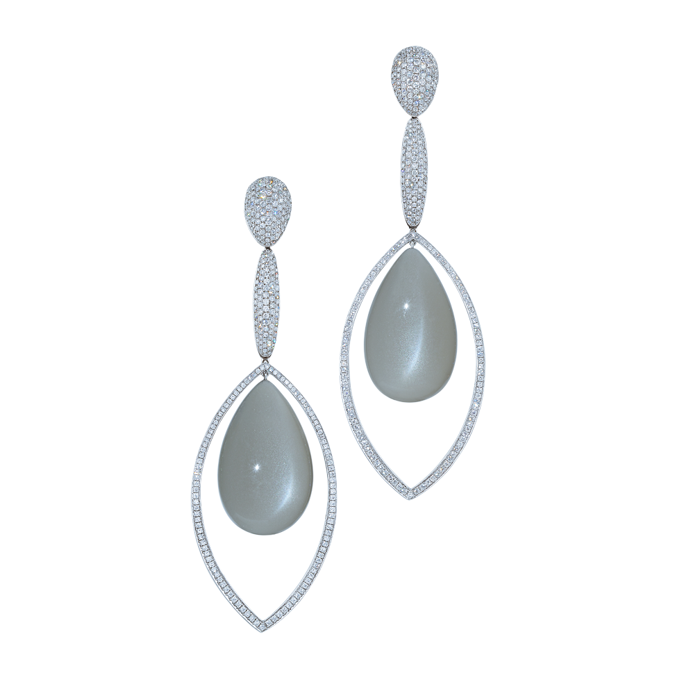 Ohrringe mit tropfenförmigen cremegrauen Mondsteinen sowie schwebenden Rahmen und Oberteilen, mit feinen weißen Diamanten besetzt und in 750/000 Weißgold gefasst. Maßanfertigung, gezeigte Länge 7 cm.