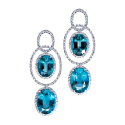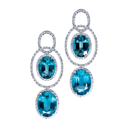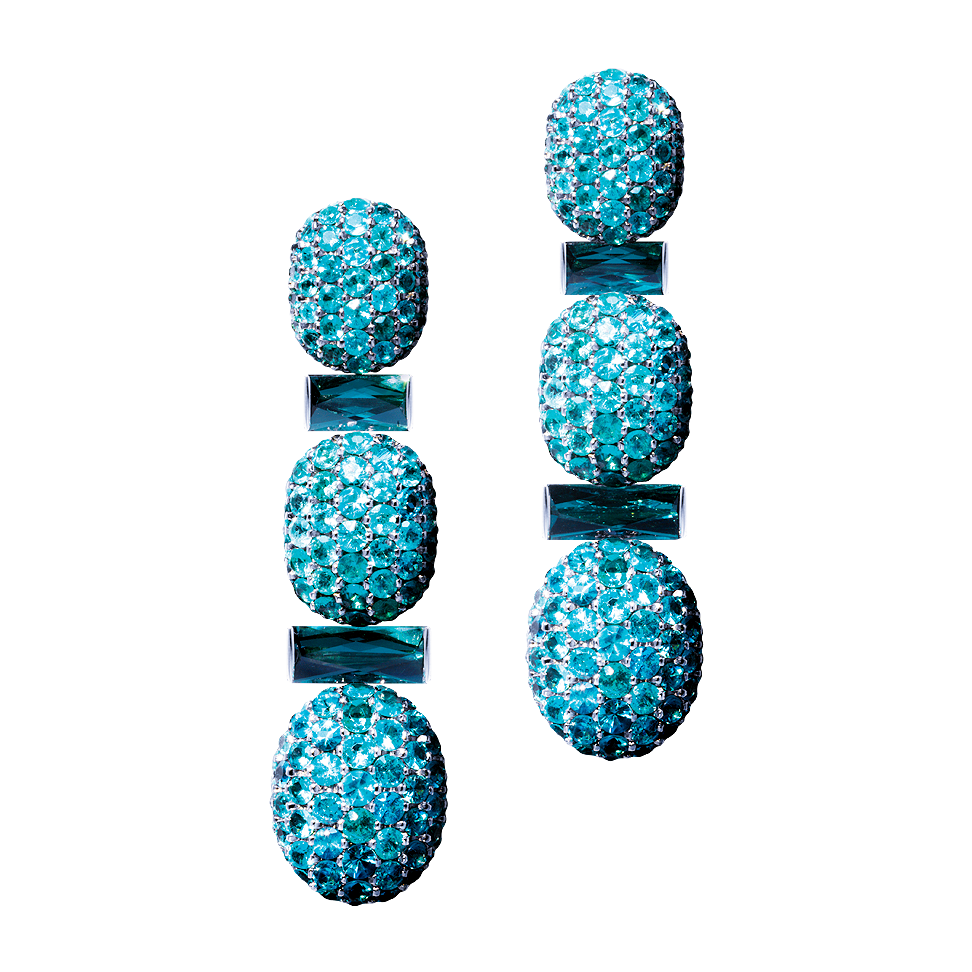 Ohrringe aus antikovalen, mit brasilianischen Paraiba-Turmalinen besetzten Cabochons und baguetteförmigen Afghanistan-Turmalinen, in 750/000 Weißgold gefasst. Maßanfertigung, gezeigte Länge 5 cm.
