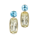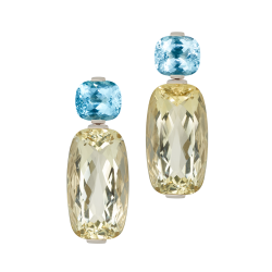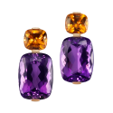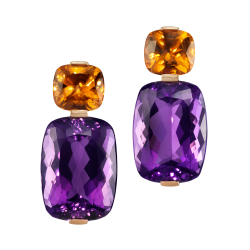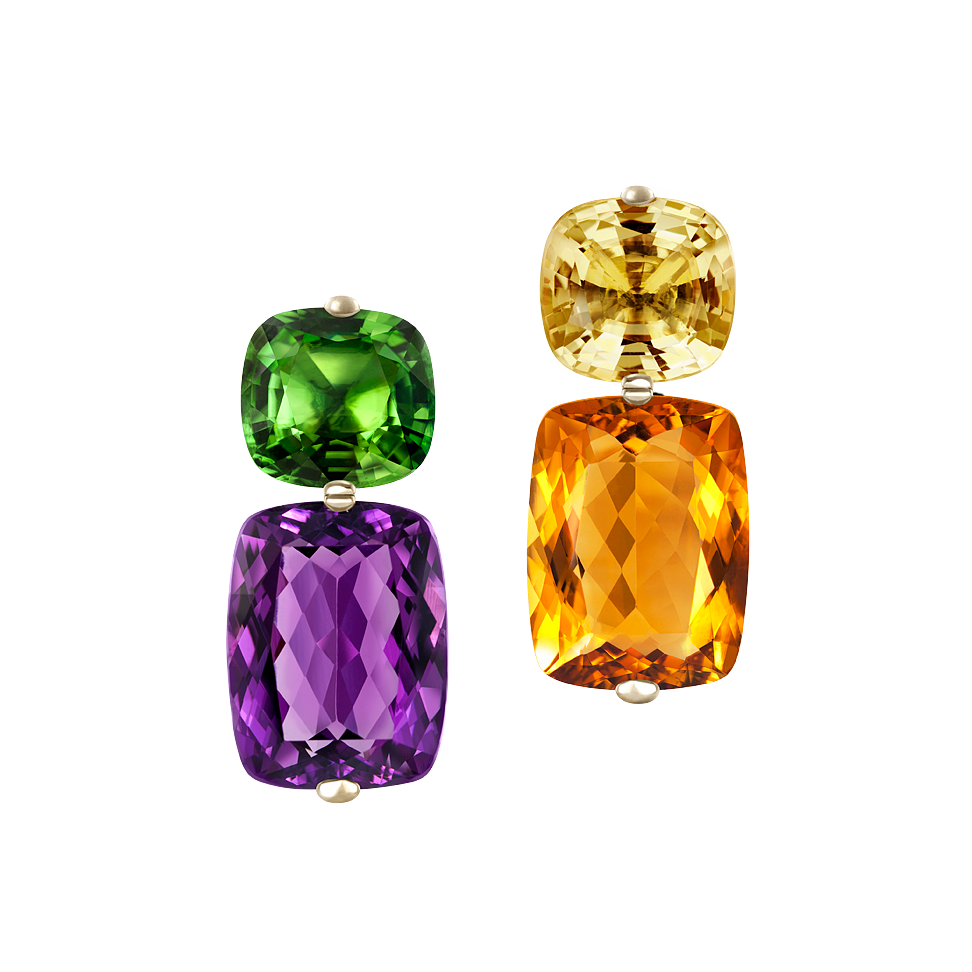 Ohrringe mit antikoval geschliffenem lilafarbenem Amethyst, orangenem Citrin, grünem Peridot und gelbem Citrin, in 750/000 Weißgold gefasst. Maßanfertigung, gezeigte Länge 4 cm.