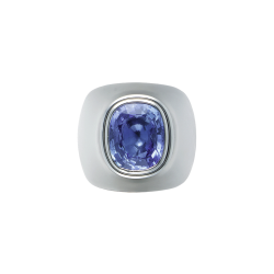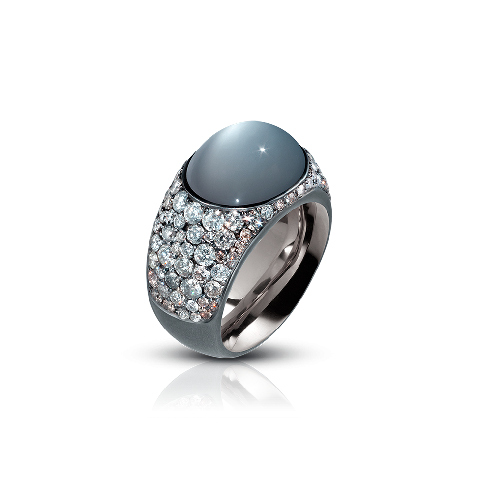 Ring mit grauem Mondstein-Cabochon von 14 ct., gebettet in graue Diamanten, in Silberbronze gefasst und innen mit 750/000 Weißgold ausgekleidet.