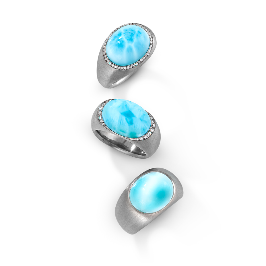 In den Larimar-Cabochons der Ringe „Heaven On Earth“ zeichnen sich die verschiedenen Wolkenformen ab, während Diamanten und anthrazitfarbenes mattiertes Weißgold der Kraft der felsigen Küsten und der Gebirgswelt Ausdruck verleihen. Damit lassen die Schmuckstücke Himmel und Erde eins werden.