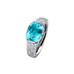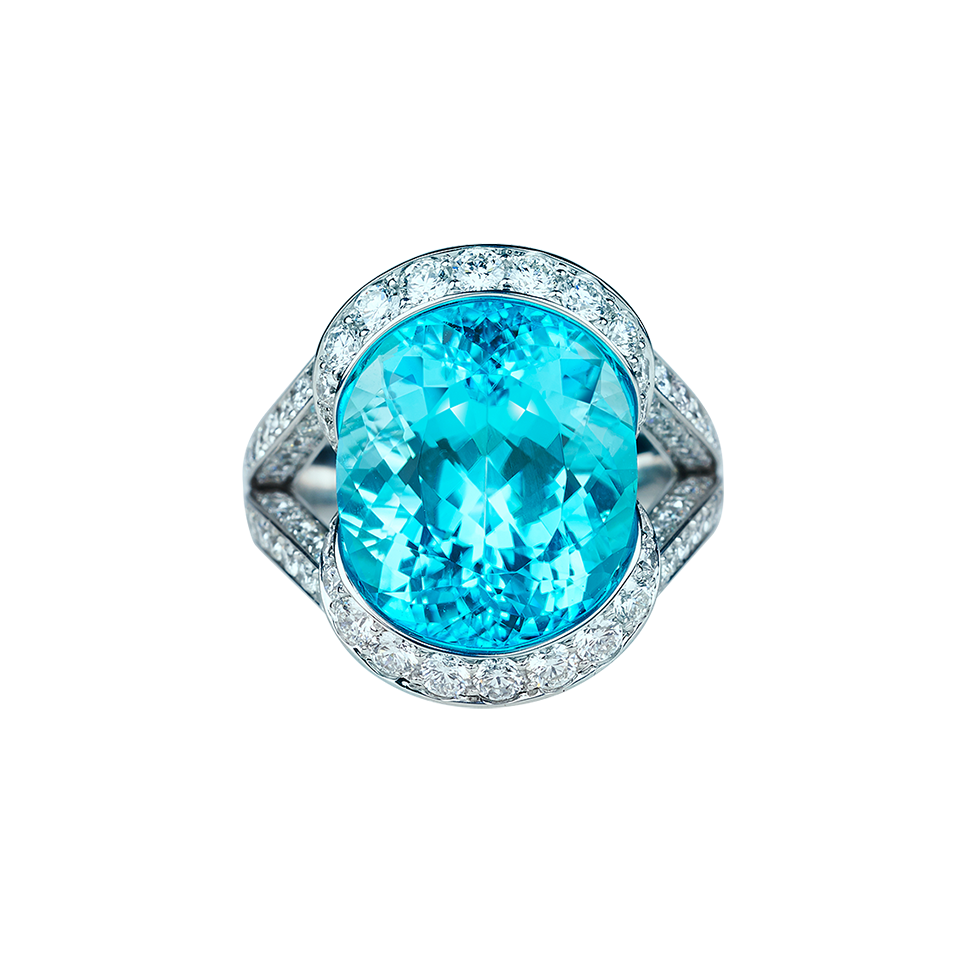 Ring mit oval facettiertem Paraiba-Turmalin von 10,5 ct., Provenienz Mosambik, teils von weißen Diamanten gerahmt und in 750/000 Weißgold gefasst.