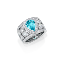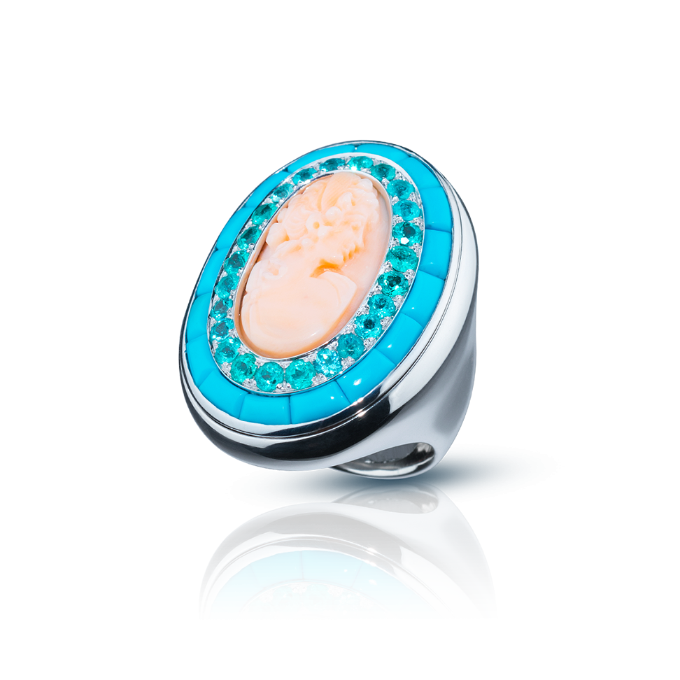Ring mit Kamee aus Engelshaar-Koralle, umrahmt von facettierten Paraiba-Turmalinen und trapezförmig eingeschliffenen Türkisen, in 750/000 Weißgold gefasst.