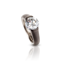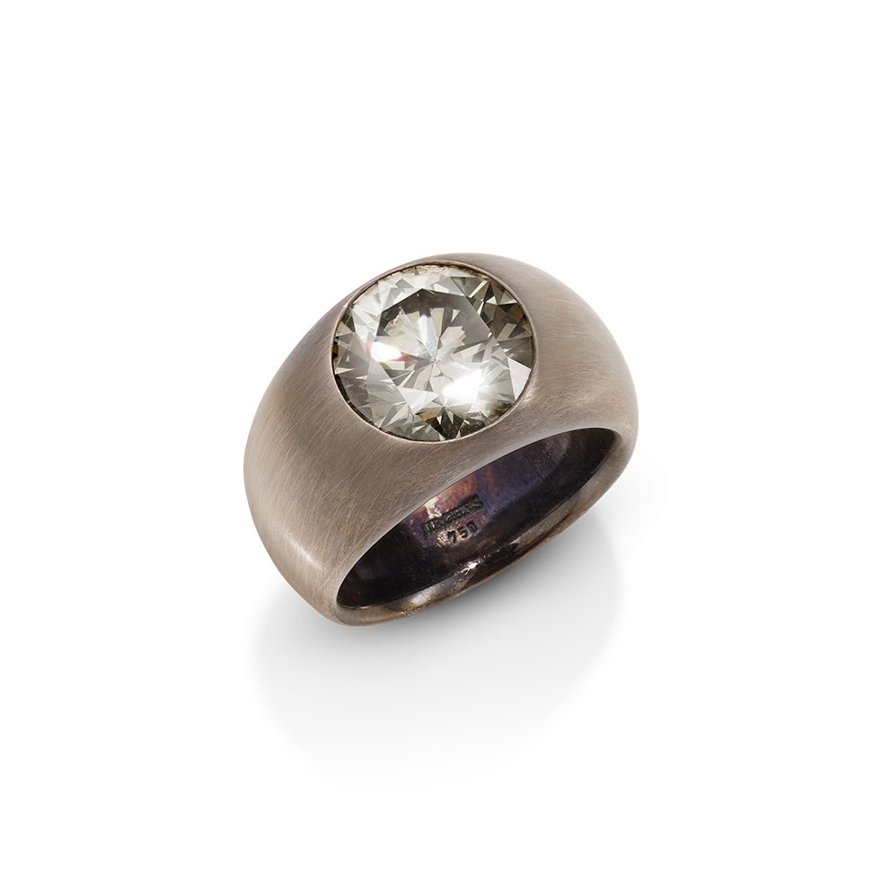 Ein grauer Diamant von 6,01ct wird getragen von einer mit mattierter Silberbronze gekleideten Ringschiene in 750/000 Weißgold.
