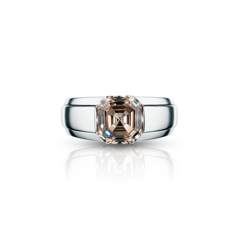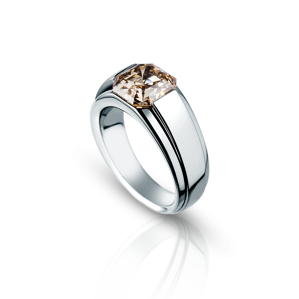Ring mit gelbbraunem Diamanten von 3,23 ct. im Achtkant-Schliff, in Platin Iridium gefasst.