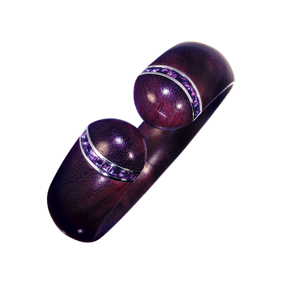 Armreif aus Amaranth-Holz mit Amethyst-Baguettes in Platin gefasst und einer unsichtbaren Drehmechanik versehen.