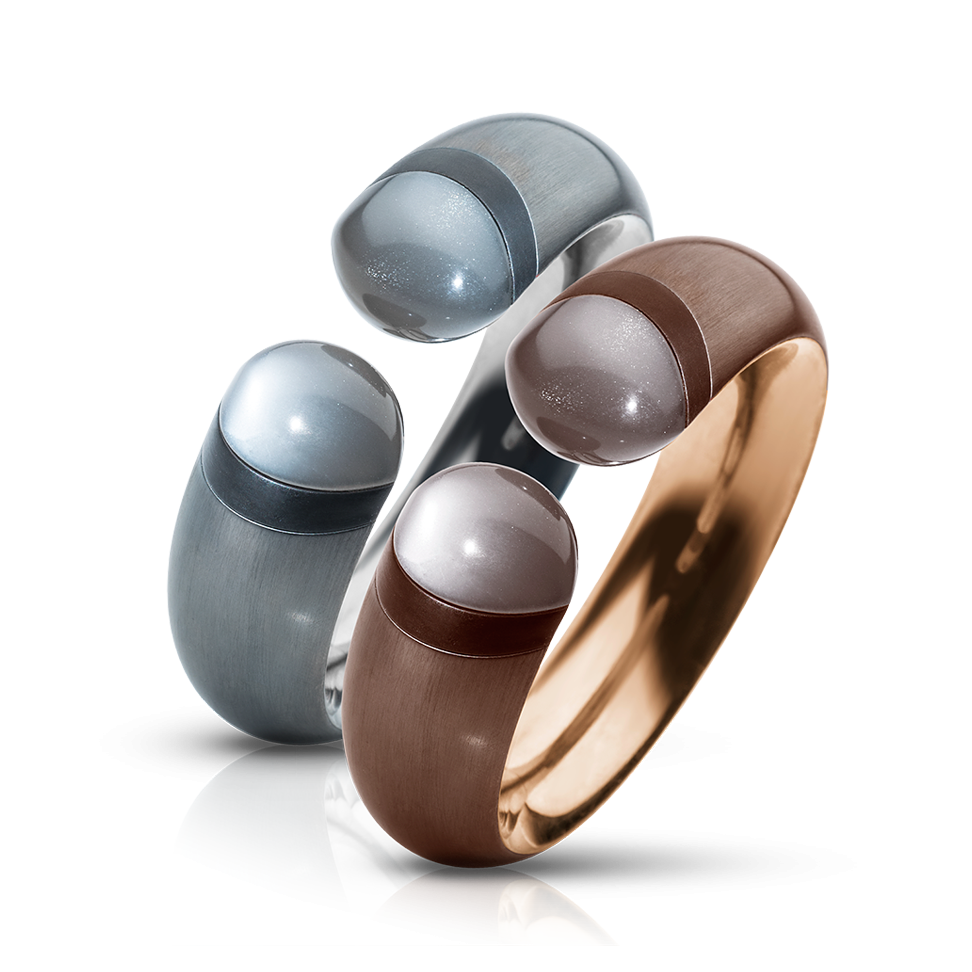 Armreif mit grauen Mondsteinen und mattierter Silberbronze, innen mit 750/000 Weißgold ausgekleidet und mit unsichtbarer Drehmechanik versehen.