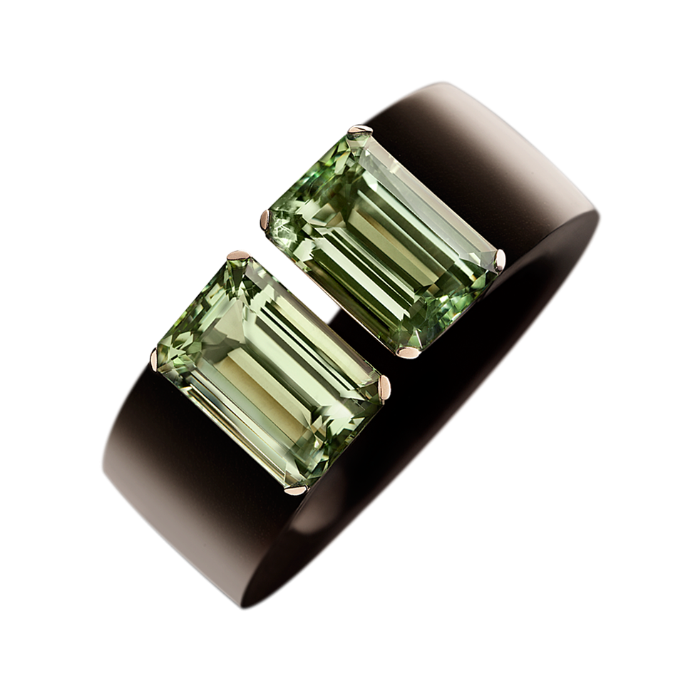 Armreif aus Ebenholz mit Goldberyllen im Achtkant-Schliff, in 750/000 Weißgold gefasst und unsichtbarer Drehmechanik versehen.