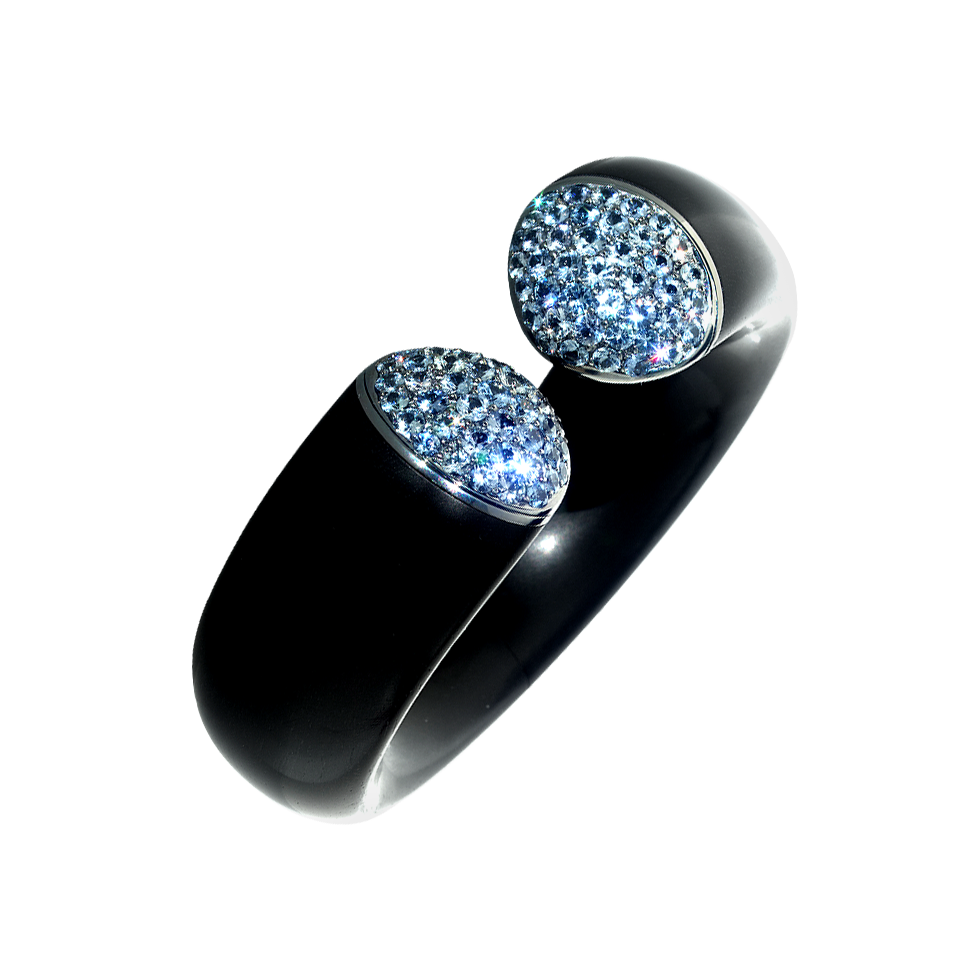 Armreif aus Ebenholz mit silber-blauen Sri Lanka-Saphiren, in 750/000 Weißgold gefasst und mit unsichtbarer Drehmechanik versehen.