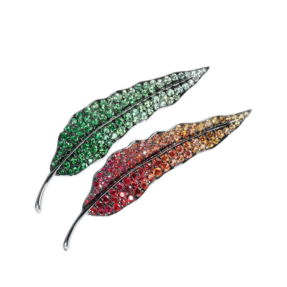 Broschen-Paar mit Saphiren und Tsavoriten, zu stilisierten Aspedistra-Blättern in schwarz rhodiniertem 750/000 Weißgold gestaltet.