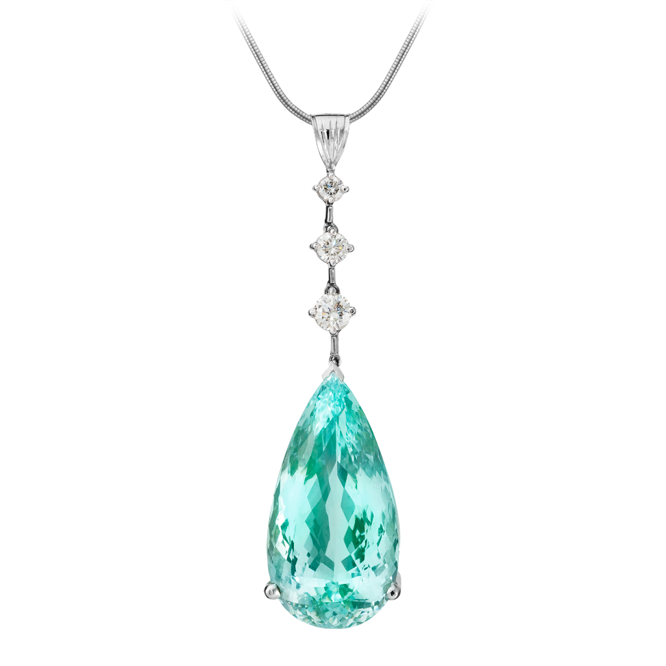 Halskette mit facettiertem Aquamarin-Tropfen von 35 ct. und Brillanten, in 750/000 Weißgold gefasst.