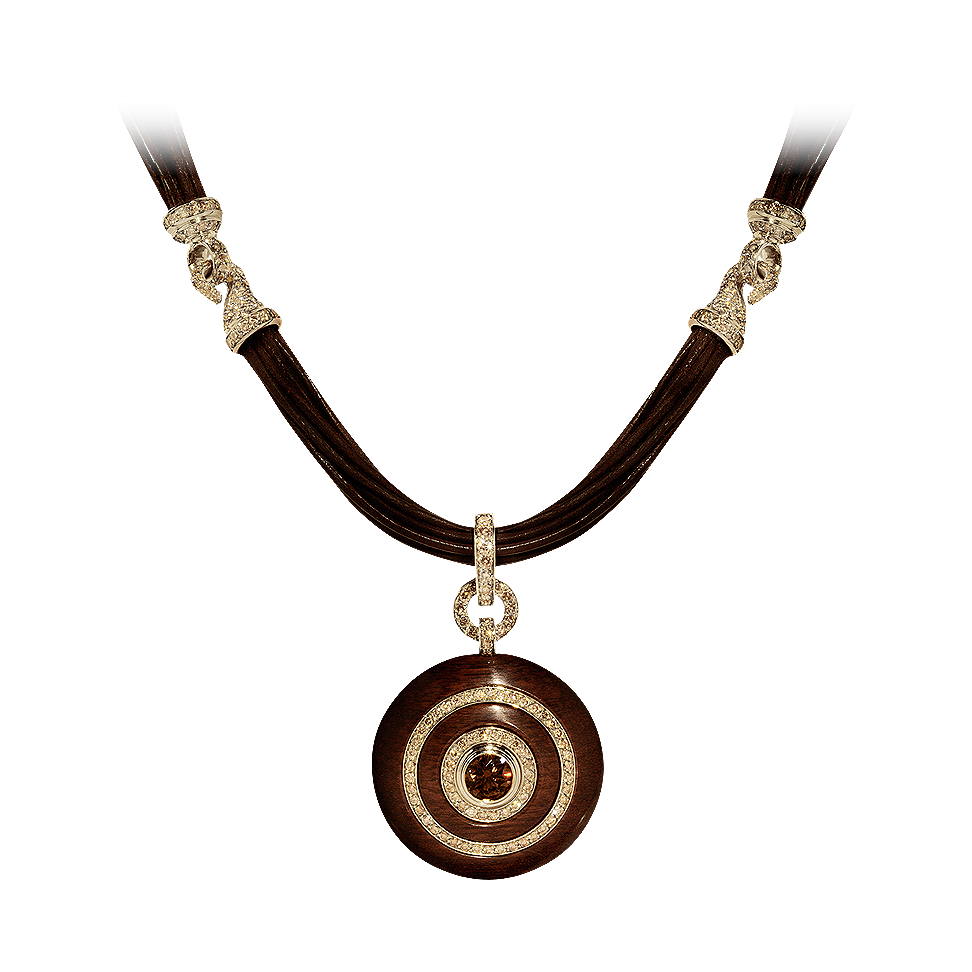Halskette mit naturfarbenen Brillanten in Schlangenholz, brillantbesetzten Haken-Verschlüssen und Lederband, in 750/000 Roségold gefasst.
