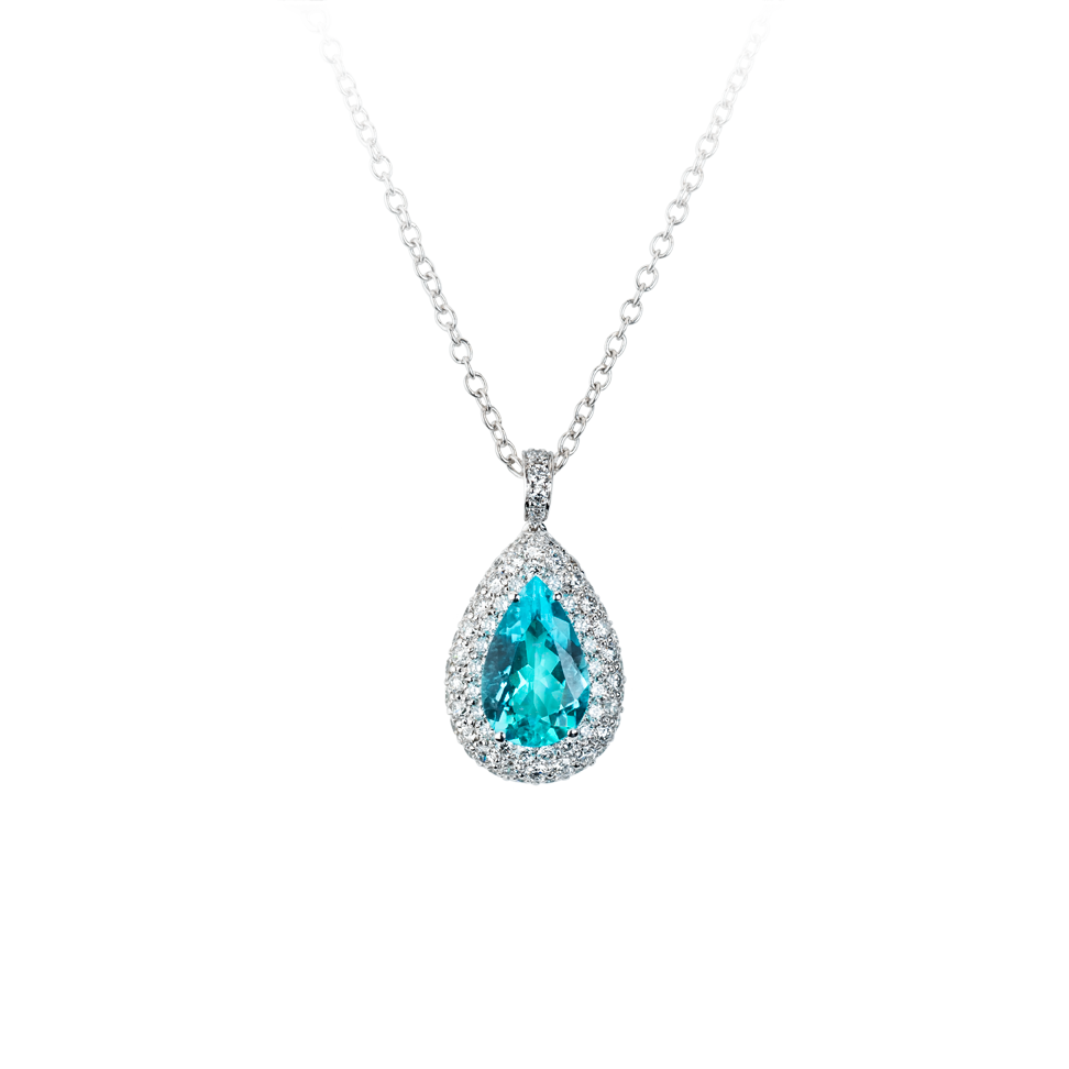 Halskette mit facettiertem Paraiba-Turmalin-Tropfen von 1,45 ct., von feinen hochweißen Diamanten gerahmt und in 750/000 Weißgold gefasst.