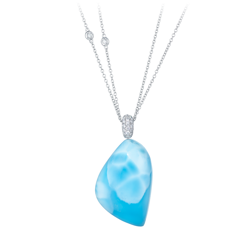 Larimar-Welle an zwei Diamant-Weißgold-Ketten.