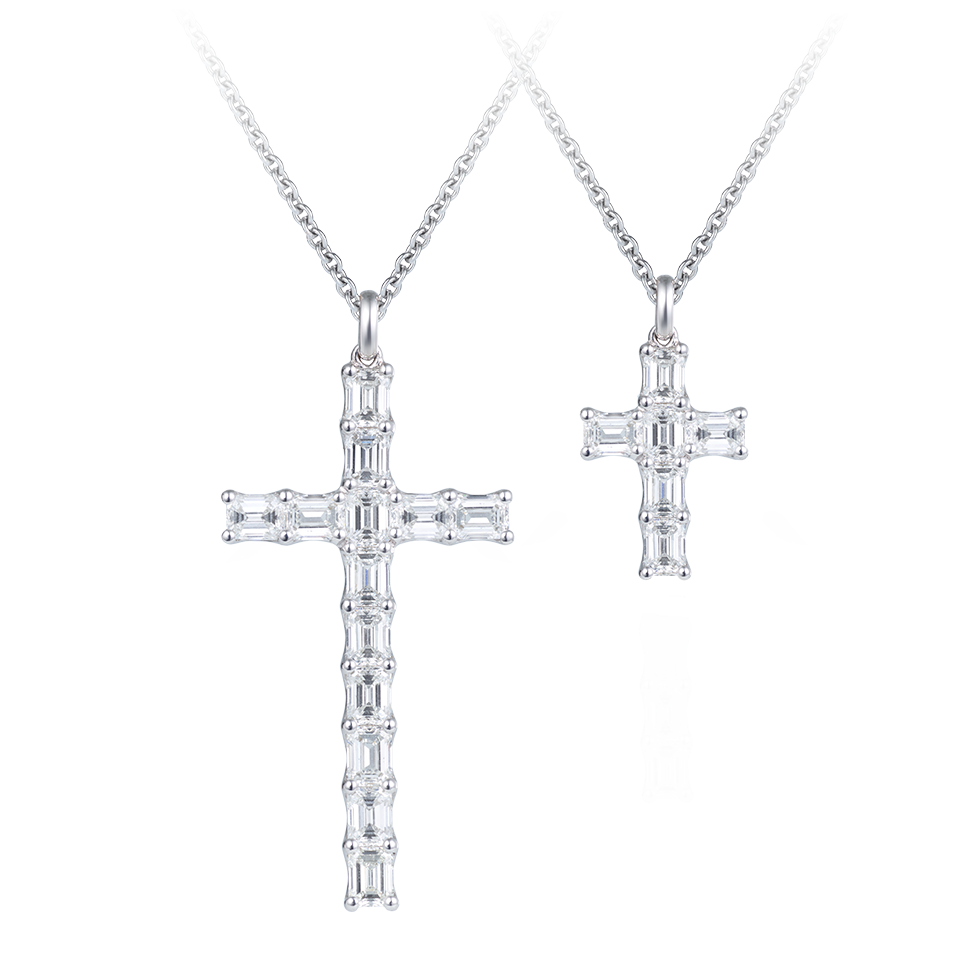 Halskette mit einem Kreuz aus Diamanten im Emerald Cut von 3,13 ct., in Platin gefasst. Das kleine Kreuz aus Diamanten im Emerald Cut 0,9ct., in Weissgold gefasst.