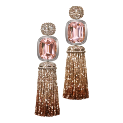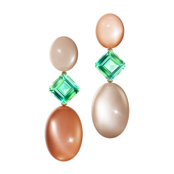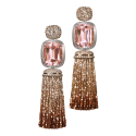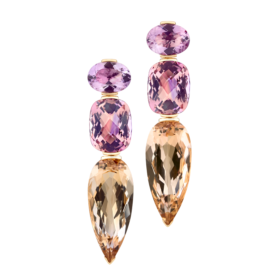 Ohrringe mit schlanken Citrin-Tropfen, antikoval geschliffenen Ametrinen, einem Mischkristall aus Amethyst und Citrin, sowie ovalen Amethysten, in 750/000 Roségold gefasst. Maßanfertigung, gezeigte Länge 5,5 cm.