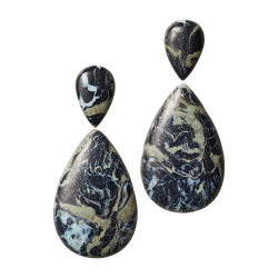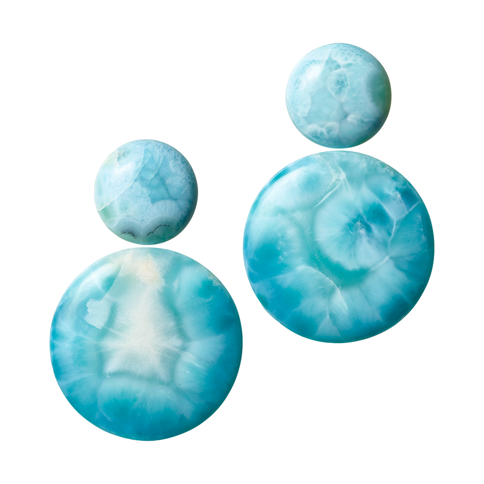 Ohrringe aus gerundetem Larimar, mit weiteren Edelsteinen individualisierbar. Dank unsichtbarer Wechselmechaniken lassen sich die Oberteile einzeln tragen oder mit anderen Anhängern kombinieren. Maßanfertigung, gezeigte Länge 8 cm.